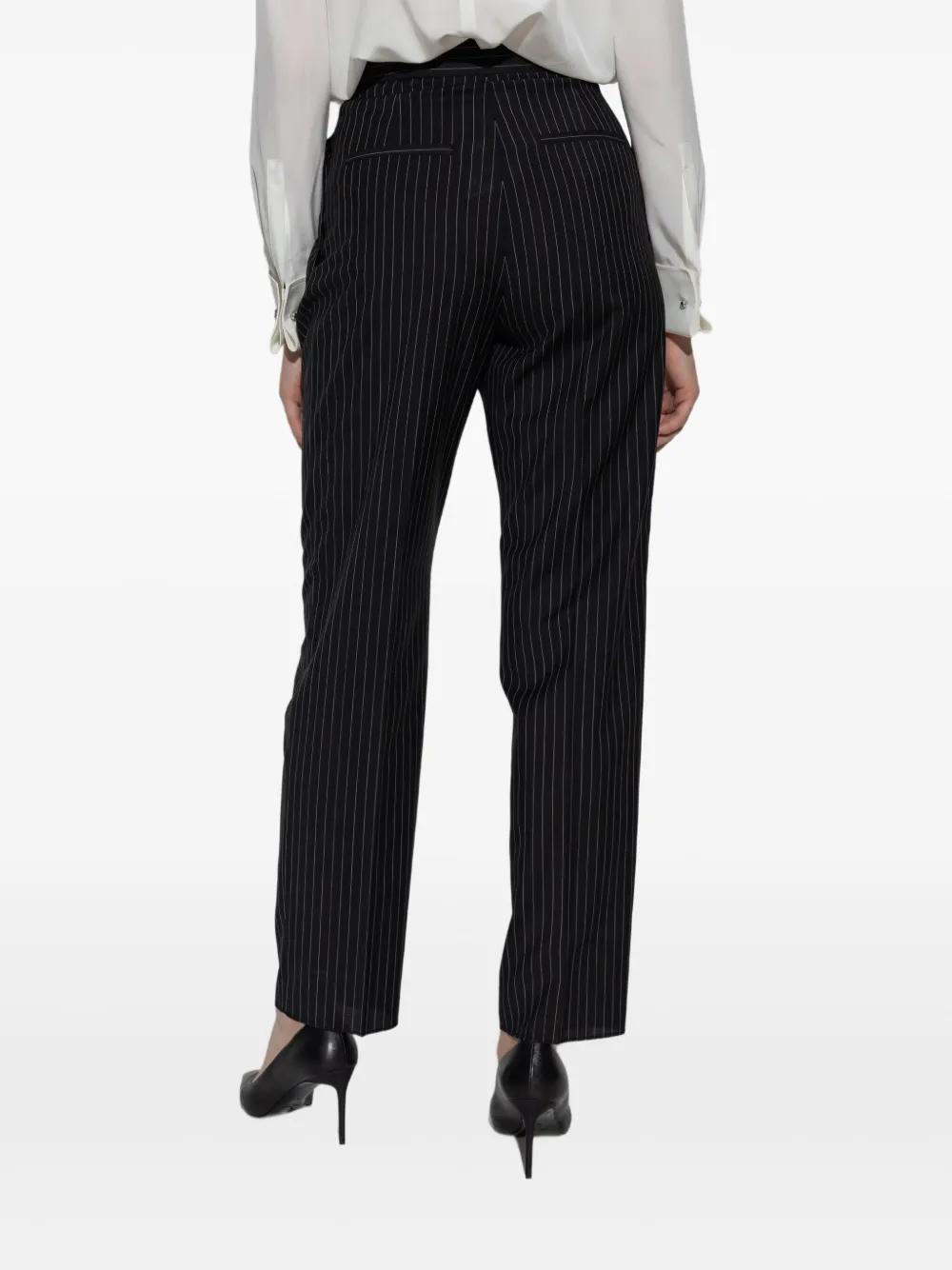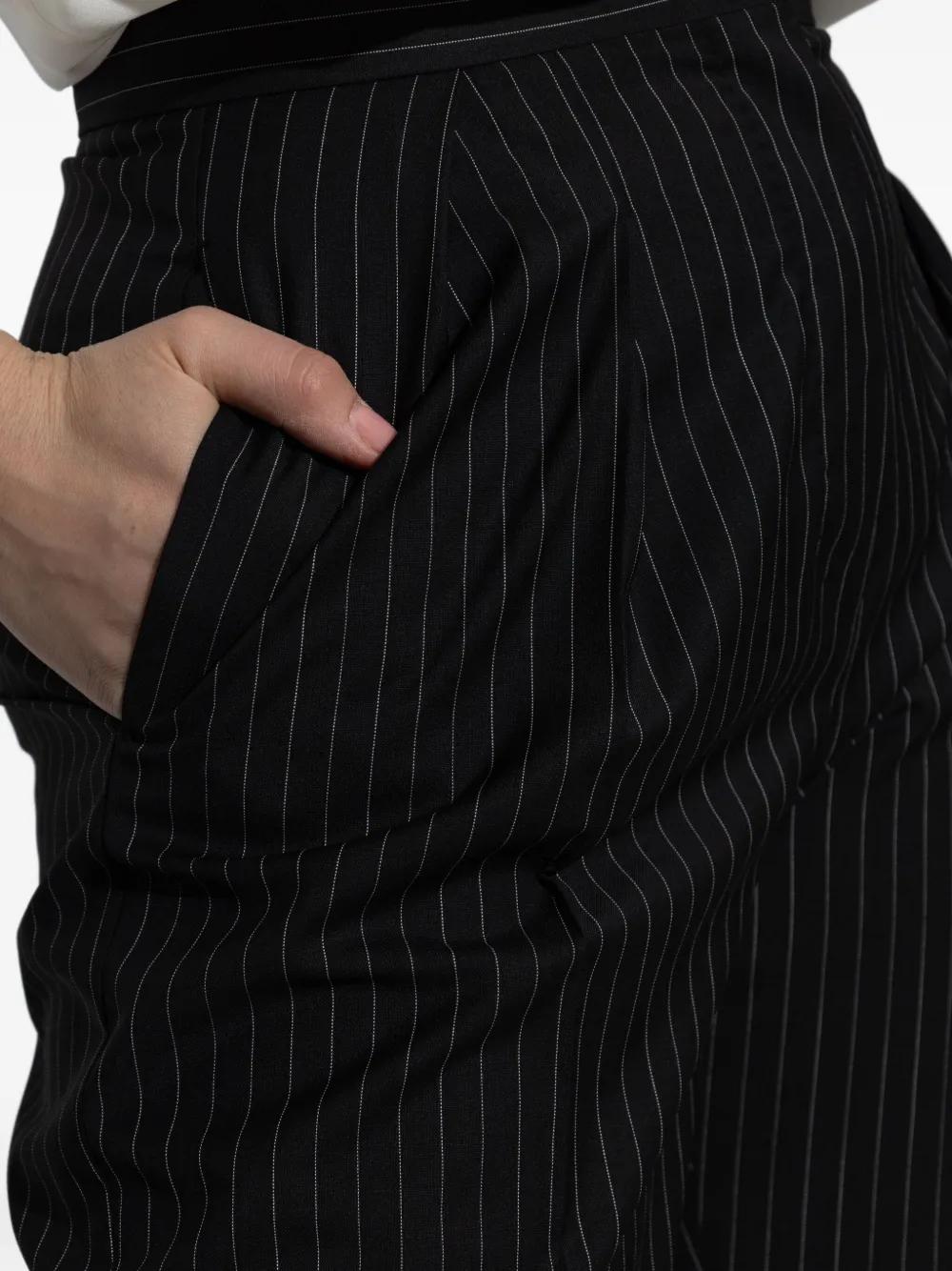 black vertical pinstripe pattern pleated front detailing tapered leg concealed fastening side pockets