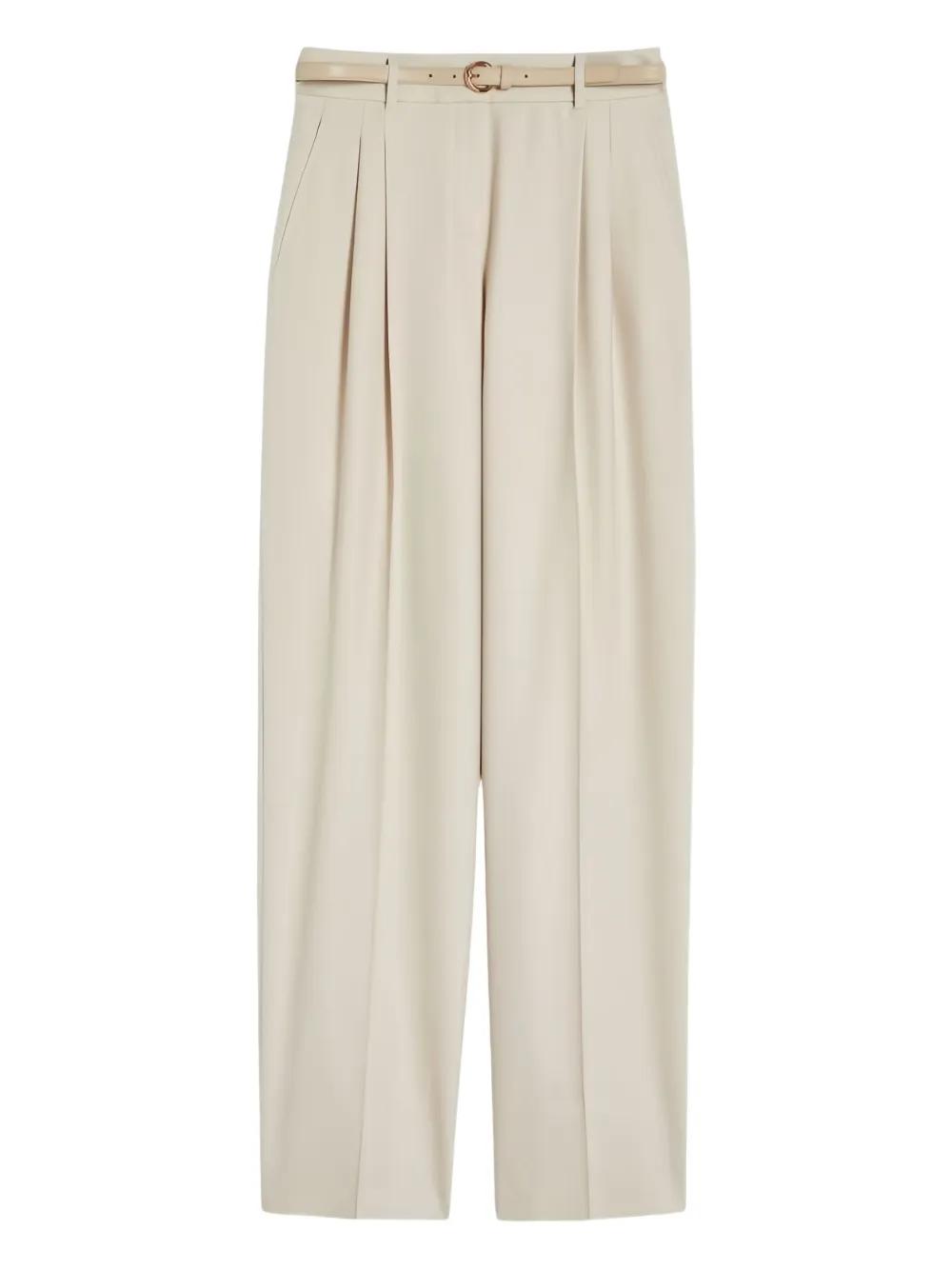 beige virgin wool-blend pleated front belt loops matching belt slash pockets