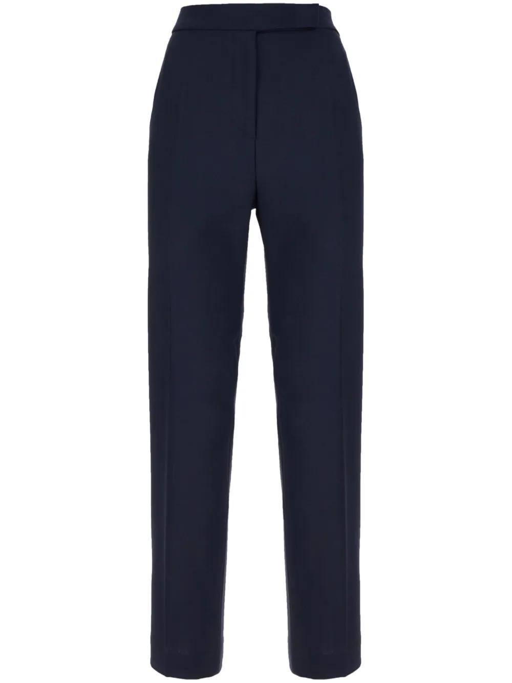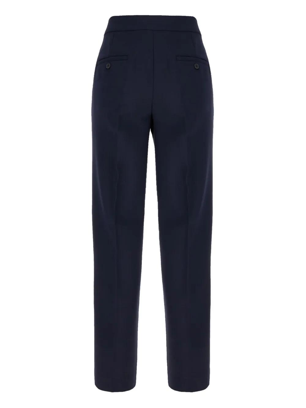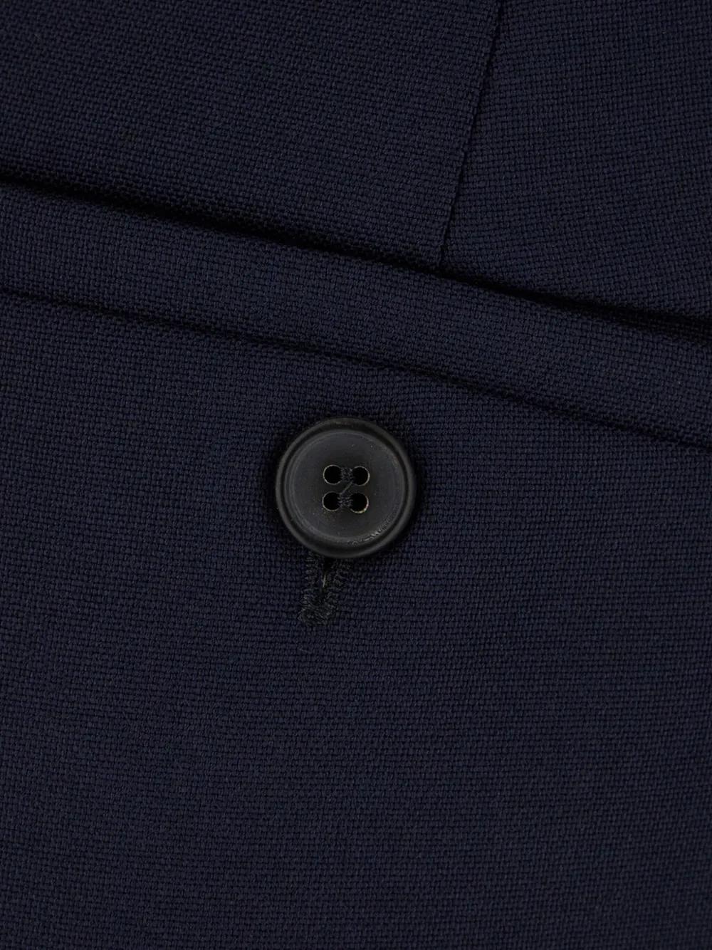 navy blue hook and zip fly fastening two side inset pockets two rear welt pockets pressed crease