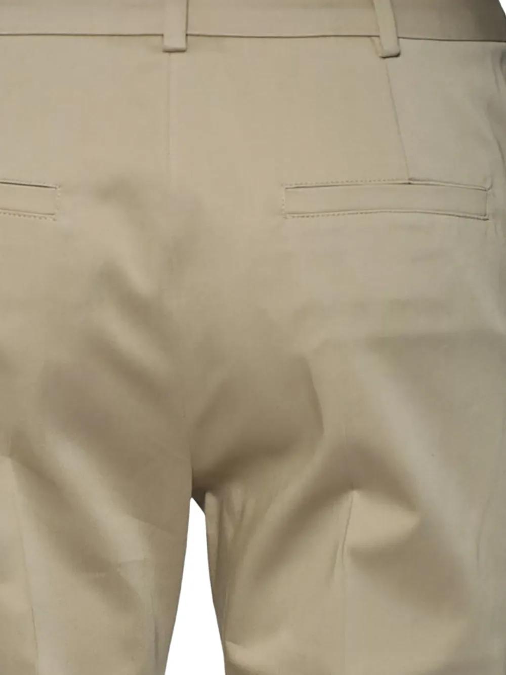 beige front pleats belt loops double welt pockets at the back tapered leg design