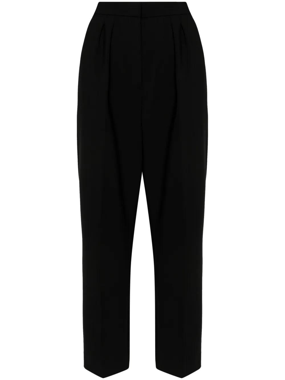 black virgin wool blend concealed front button, hook and zip fastening pleat detailing two diagonal pockets to the sides tapered leg