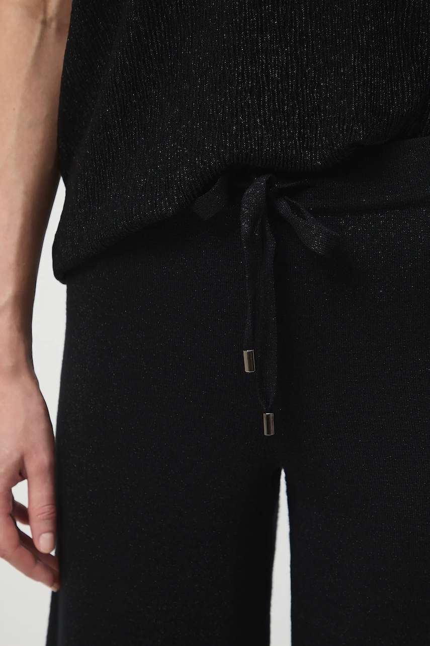 - Fason wide leg. - Regularna talia. - W pasie elastyczna listwa z troczkami. - Szeroka nogawka. - Materiał z metaliczną nicią. - Szerokość w pasie: 36 cm. - Szerokość w biodrach: 46 cm. - Wysokość stanu: 26 cm. - Szerokość nogawki na dole: 29,5 cm. - Długość wewnętrzna nogawki: 79,5 cm. - Wymiary podane dla rozmiaru: S.
