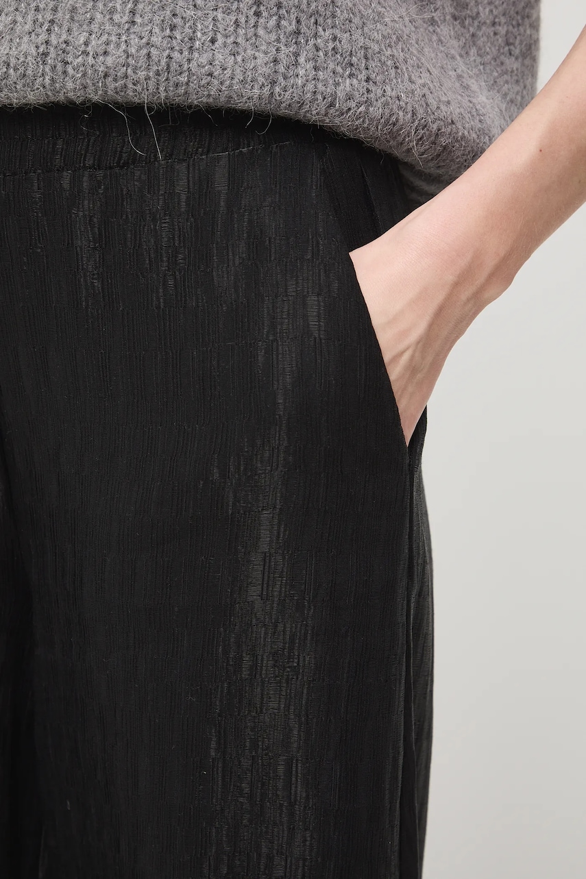 - Fason wide leg. - Regularna talia. - Elastyczna listwa w pasie. - Wsuwane kieszenie. - Szeroka nogawka. - Materiał z fakturą. - Szerokość w pasie (przed rozciągnięciem): 36 cm. - Szerokość w pasie (po rozciągnięciu): 46 cm. - Szerokość w biodrach: 51 cm. - Wysokość stanu: 28 cm. - Szerokość nogawki na dole: 34 cm. - Długość wewnętrzna nogawki: 80 cm. - Wymiary podane dla rozmiaru: S.