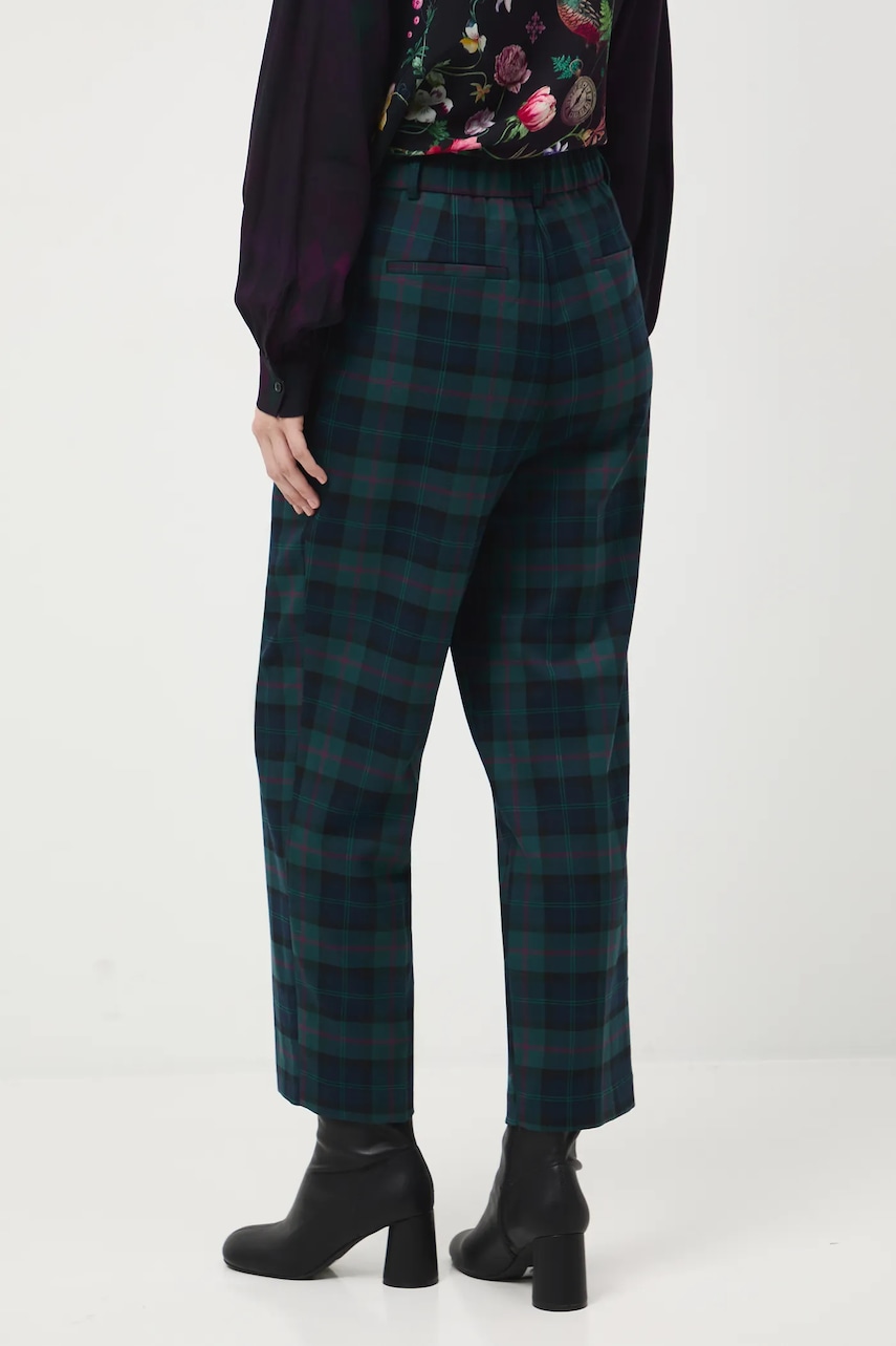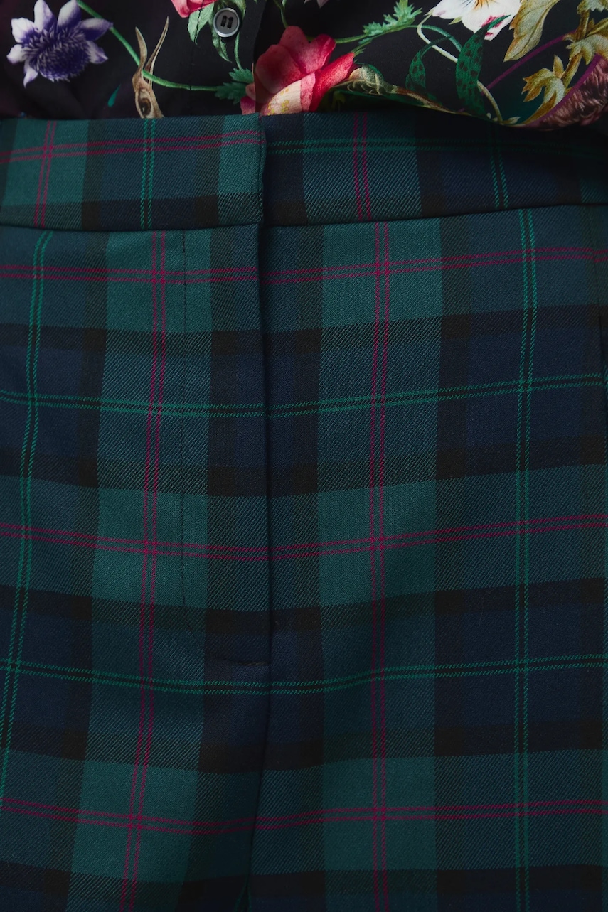 - Fason carrot. - Model z regularną talią i zapięciem na suwak i haftkę. - Elastyczna listwa w pasie. - Ozdobne zakładki. - Wzorzysta tkanina. - Wzór w kratę. - Szerokość w pasie (przed rozciągnięciem): 37,5 cm. - Szerokość w pasie (po rozciągnięciu): 42 cm. - Szerokość w biodrach: 49,5 cm. - Wysokość stanu: 32 cm. - Szerokość nogawki na dole: 20 cm. - Długość wewnętrzna nogawki: 67 cm. - Wymiary podane dla rozmiaru: S.