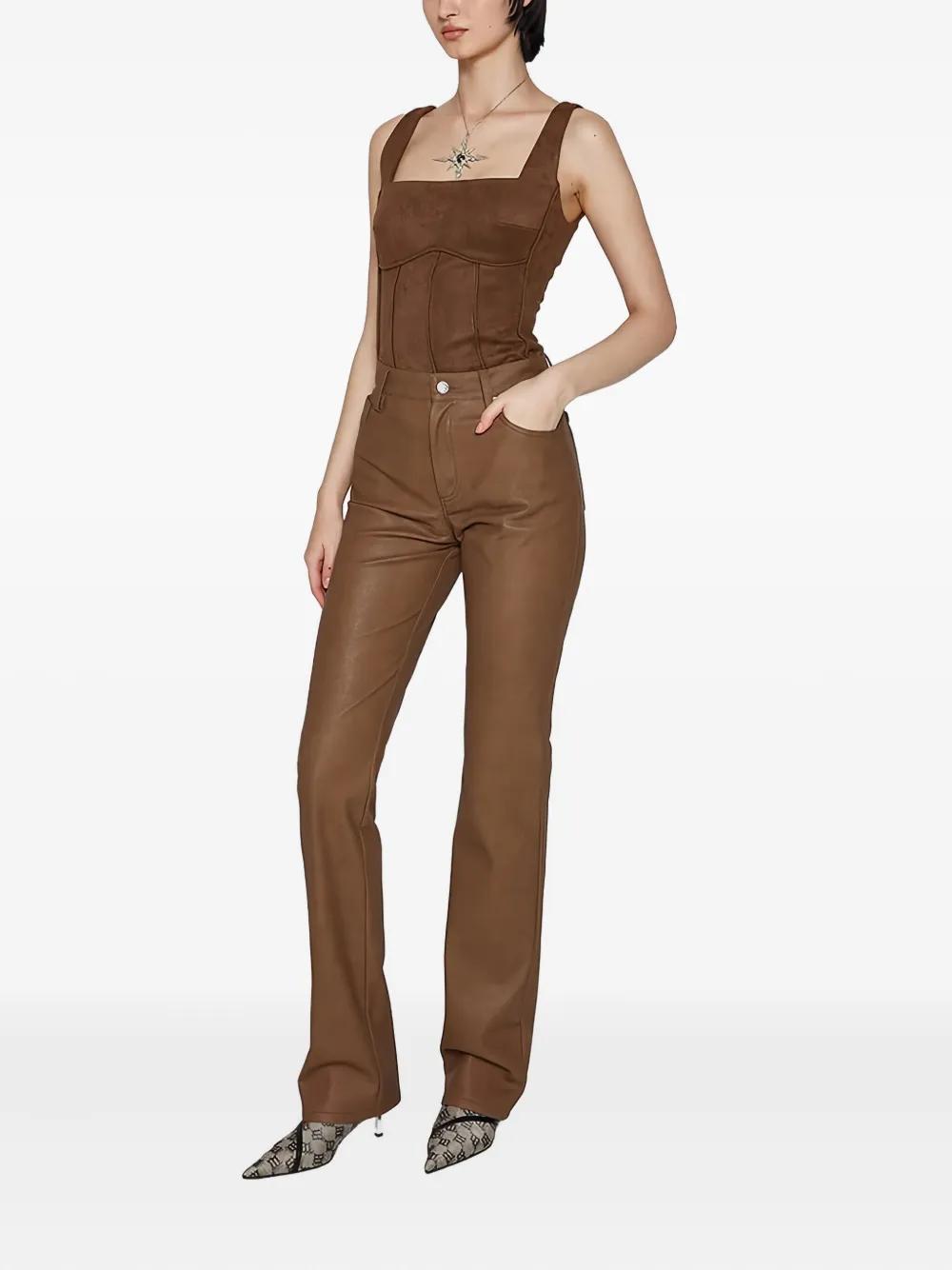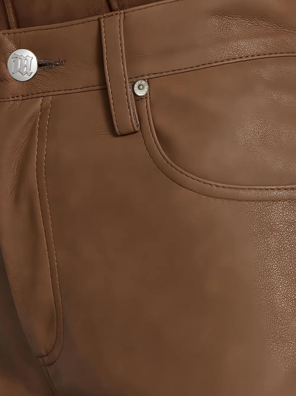 brown faux leather seven pocket styling low rise zip fly bootcut