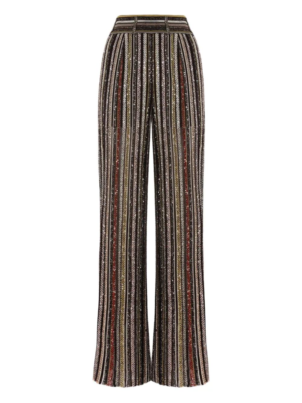 - Podwyższony stan z elastyczną listwą w pasie. - Szeroka nogawka. - Materiał z metaliczną nicią. - Dwie wsuwane kieszenie boczne. - Szerokość w pasie: 35 cm. - Szerokość w biodrach: 49 cm. - Wysokość stanu: 36 cm. - Szerokość nogawki: 32 cm. - Szerokość nogawki na dole: 32 cm. - Długość wewnętrzna nogawki: 75 cm. - Wymiary podane dla rozmiaru: 36.