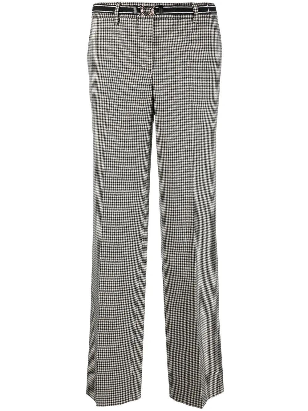black/white virgin wool/calf leather gingham check pattern high waist concealed front fastening belt loops two side slit pockets two rear welt pockets straight leg