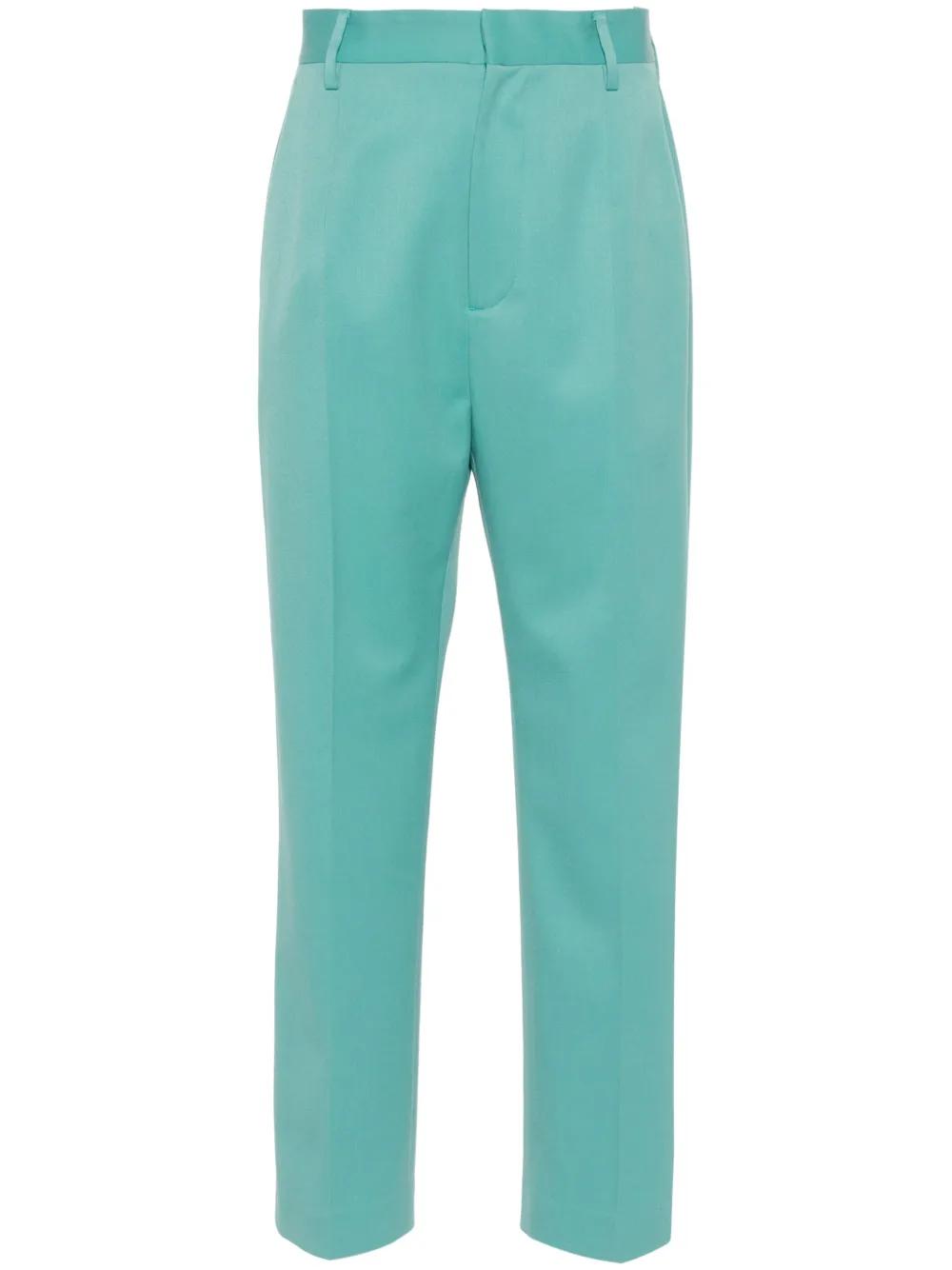 sea green twill weave belt loops at the waist pleat detailing two side slash pockets pressed crease signature single-stitch logo rear welt pocket tapered leg concealed front button, hook and zip fastening
