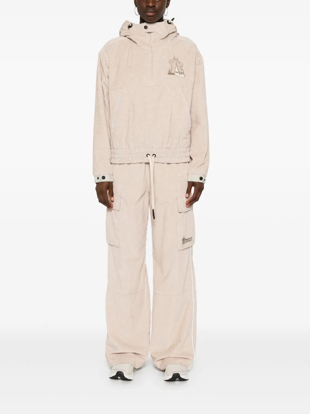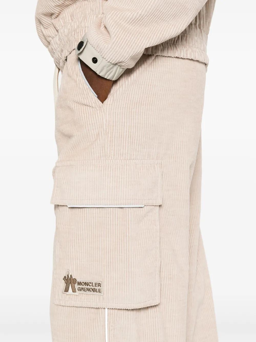powder pink cotton corduroy reflective detailing contrasting waistband two side slash pockets two side cargo pockets logo patch to the side full-length straight leg authenticity QR code elasticated drawstring waistband