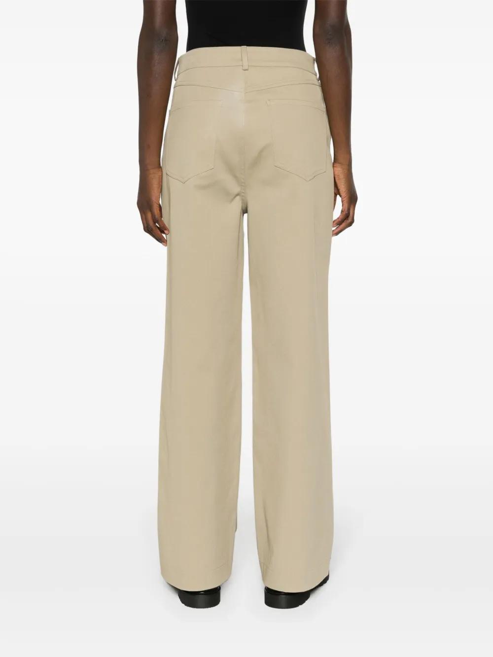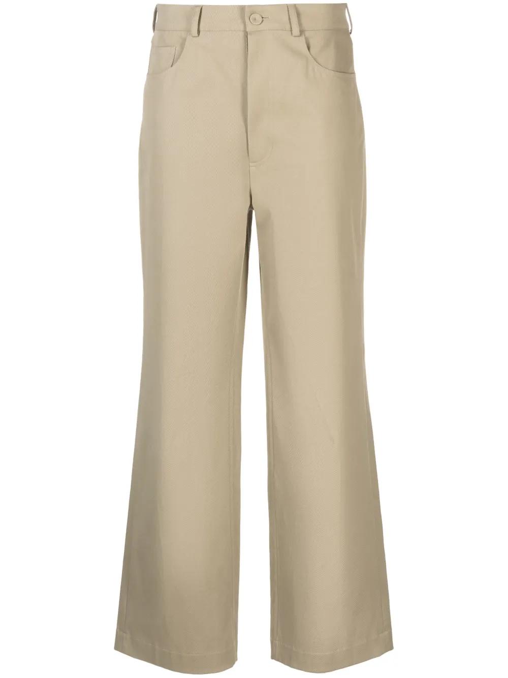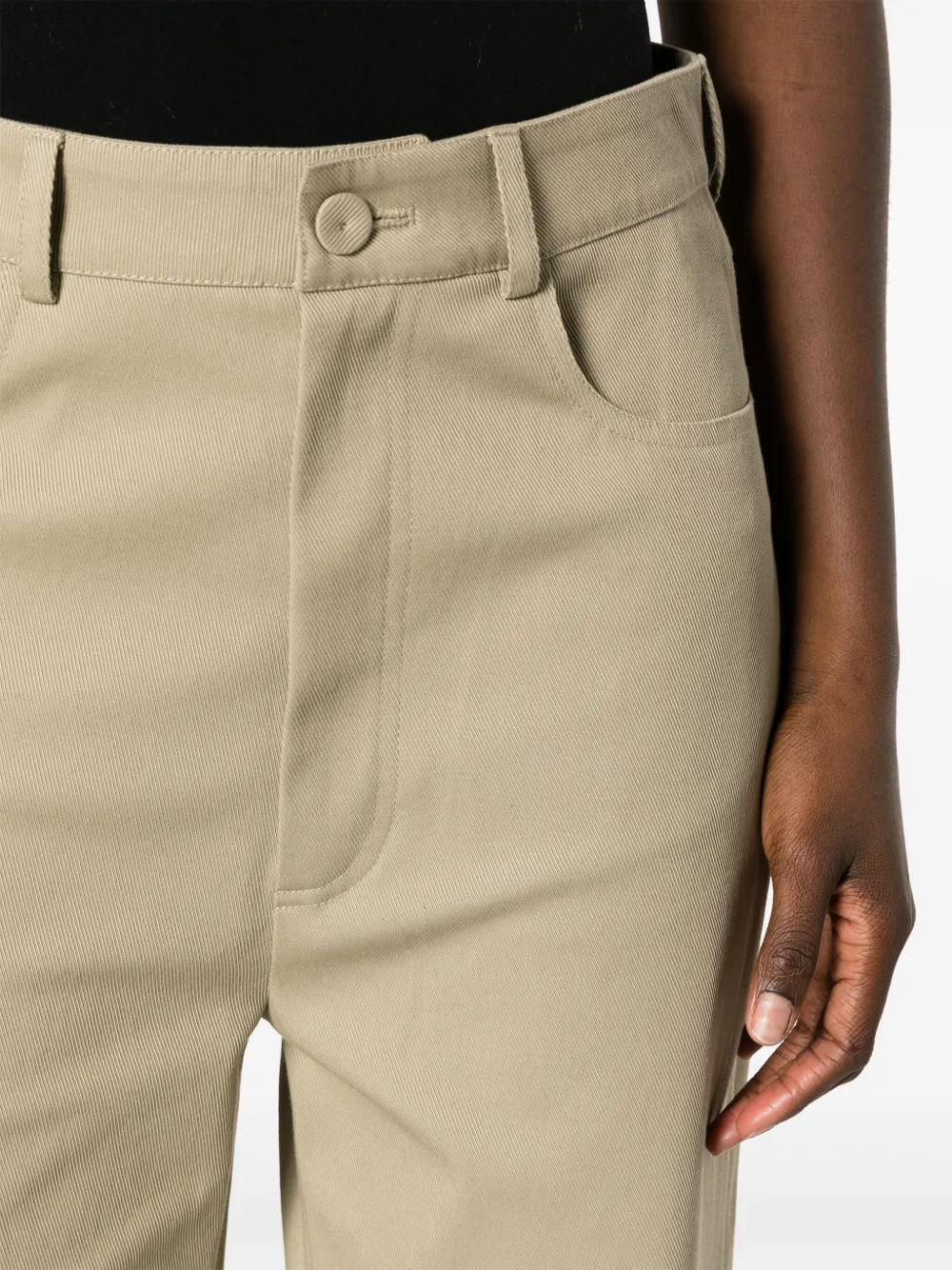 pebble beige stretch-cotton twill weave tonal stitching fabric-covered buttons zip fly fastening front button fastening belt loops high-waisted belt loops classic five pockets straight hem unlined