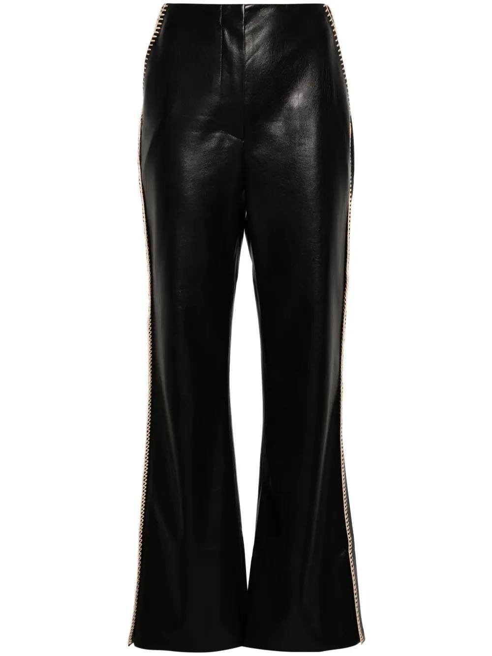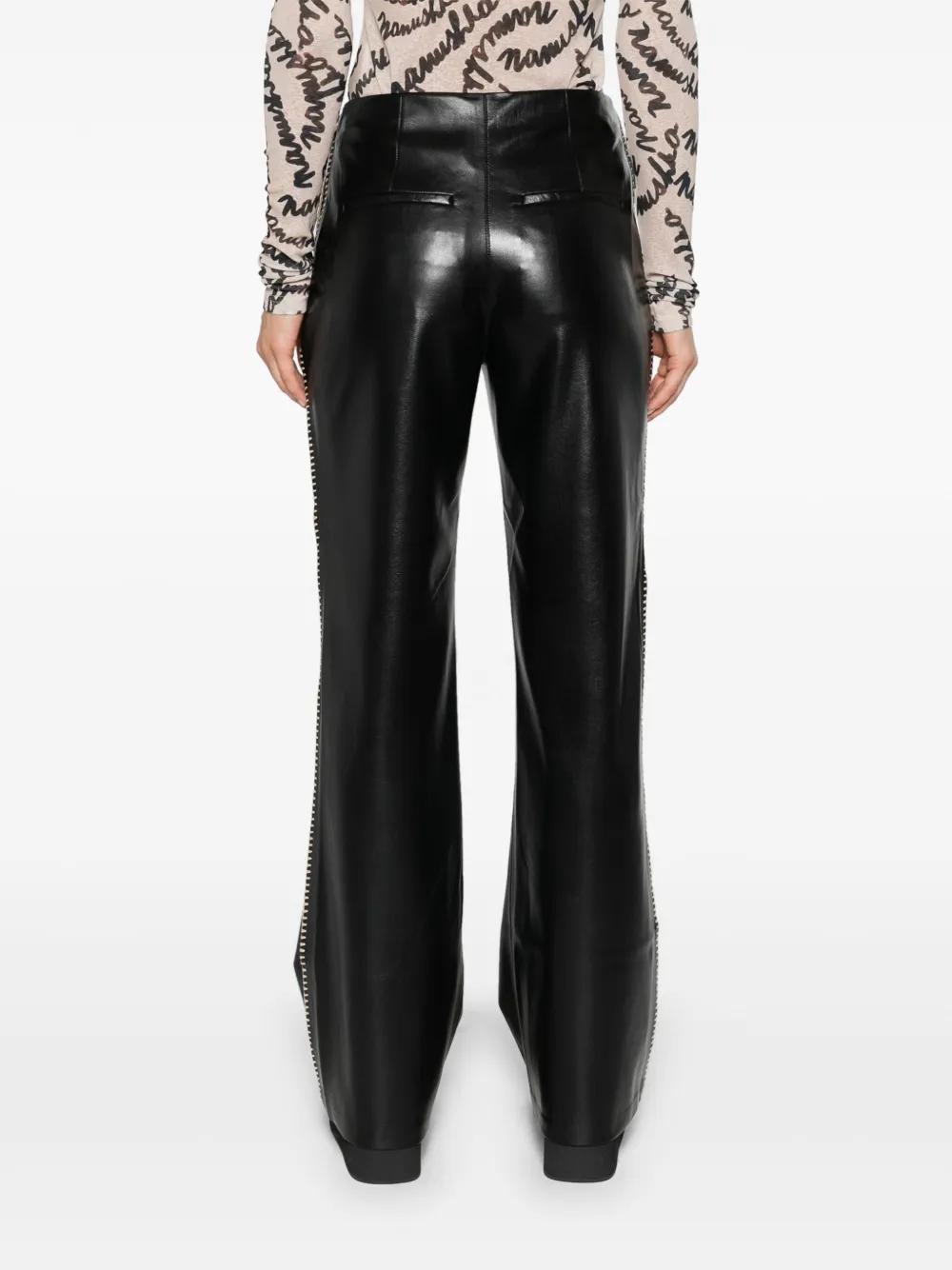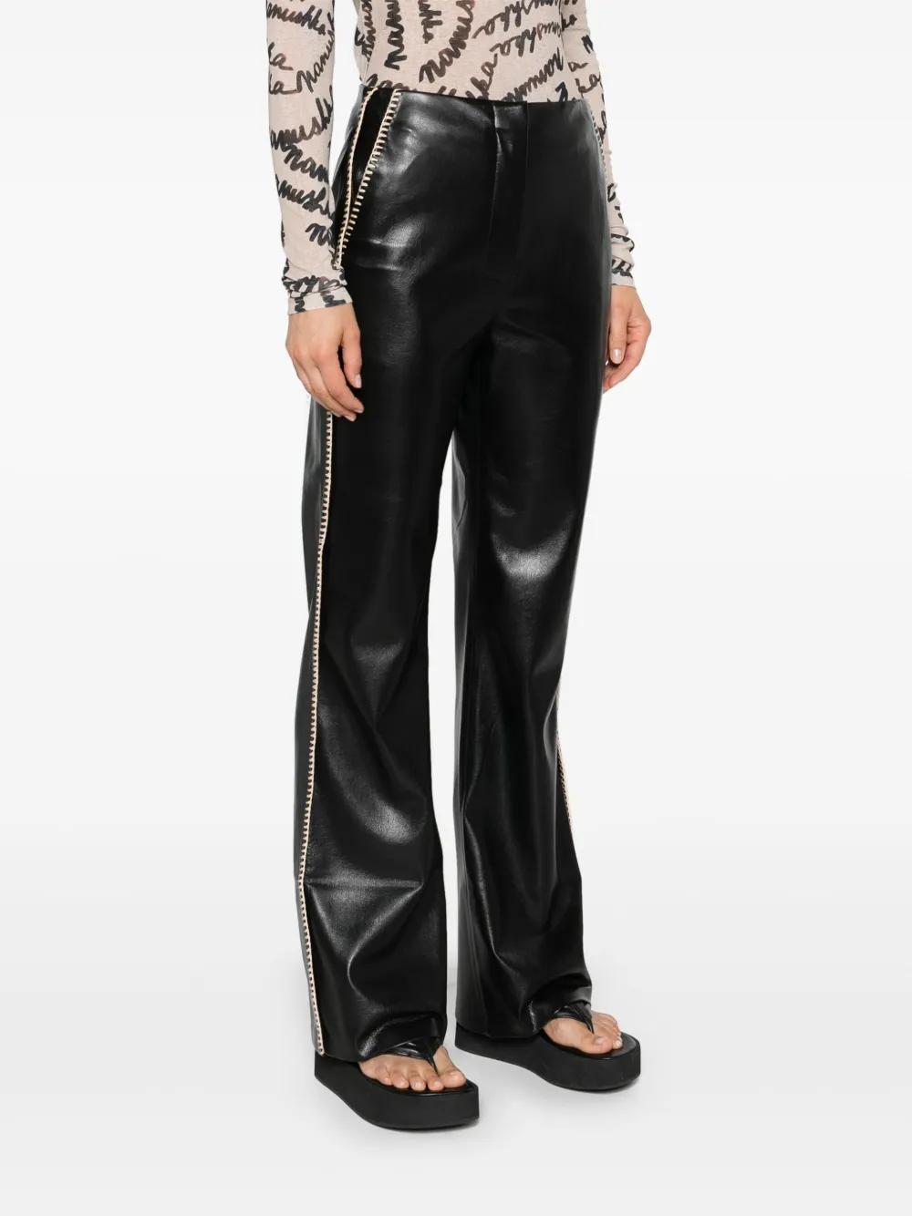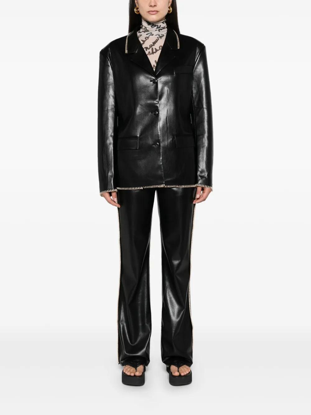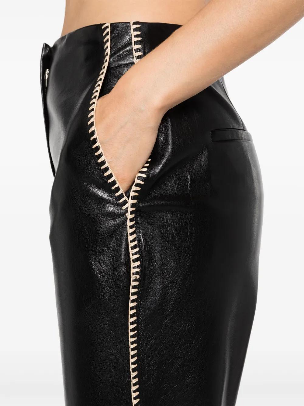 black faux leather tailored design whipstitch trim concealed front button, hook and zip fastening flared two side slit pockets two rear welt pockets straight hem