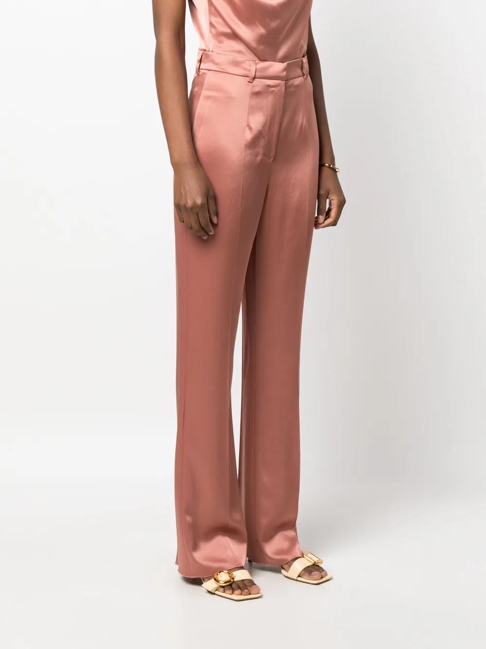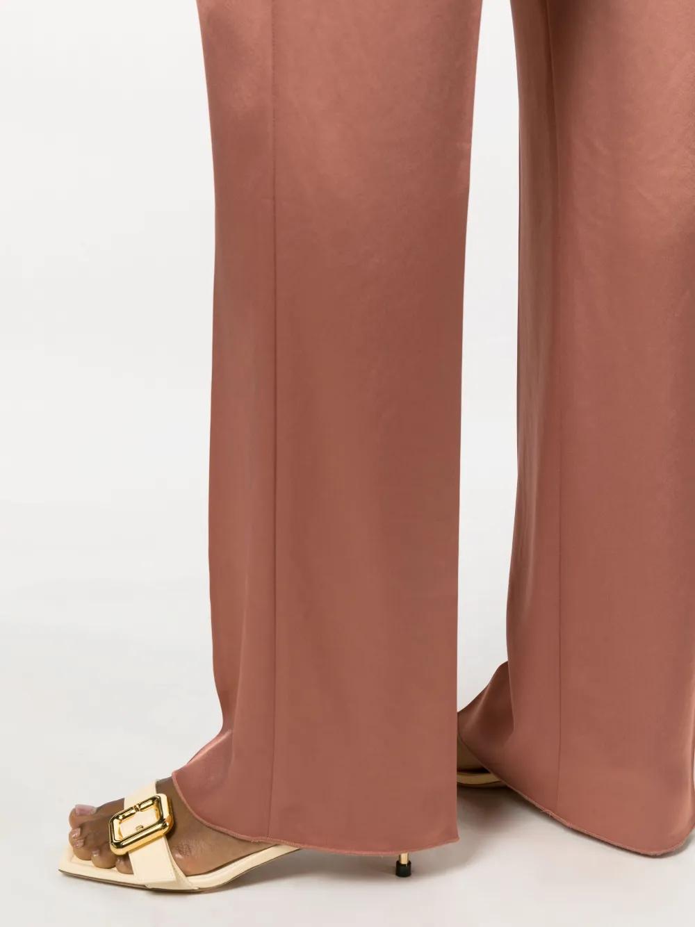 terracotta brown recycled polyester blend satin finish belt loops pressed crease concealed front fastening straight leg
