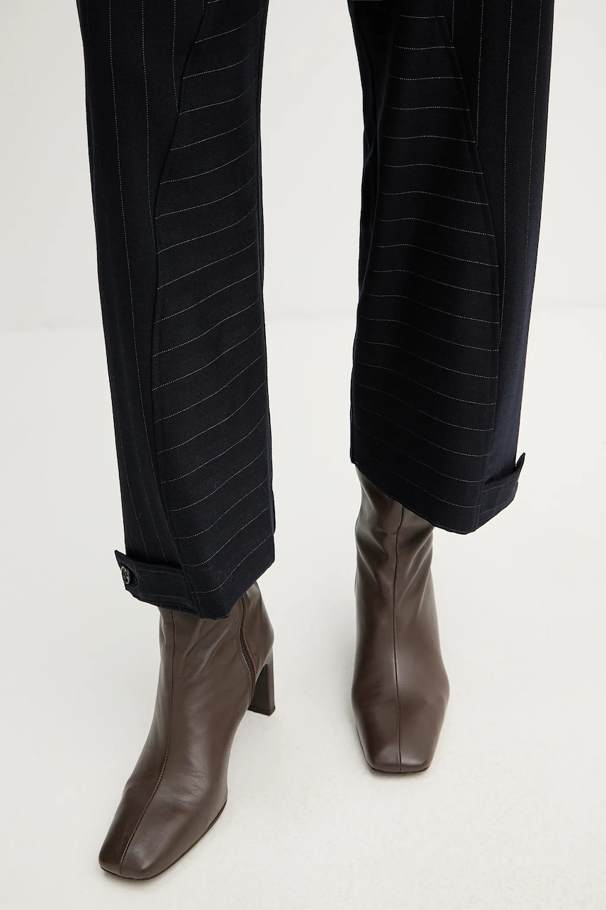 Uwaga: oryginalna rozmiarówka produktów tej marki jest rozmiarówką włoską. Informujemy, że rozmiary na metkach mogą różnić się od zamawianych ze względu na zastosowany przelicznik. - Prosty, nie blokujący ruchów fason. - U dołu nogawek regulacja szerokości na guziki. - Wsuwane kieszenie. - Model z podwyższoną talią i zapięciem na guzik i suwak. - Cienka, nieelastyczna tkanina. - Szerokość w pasie: 35 cm. - Szerokość w biodrach: 60 cm. - Wysokość stanu: 30 cm. - Szerokość nogawki na dole: 24,5 cm. - Szerokość nogawki: 35 cm. - Długość wewnętrzna nogawki: 72 cm. - Wymiary podane dla rozmiaru: 36.