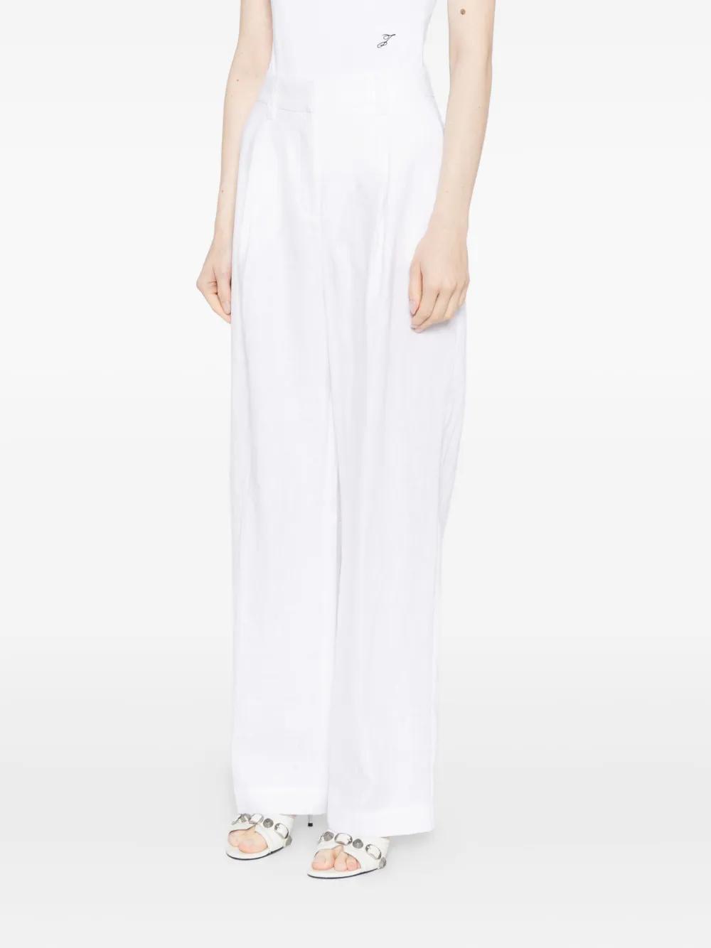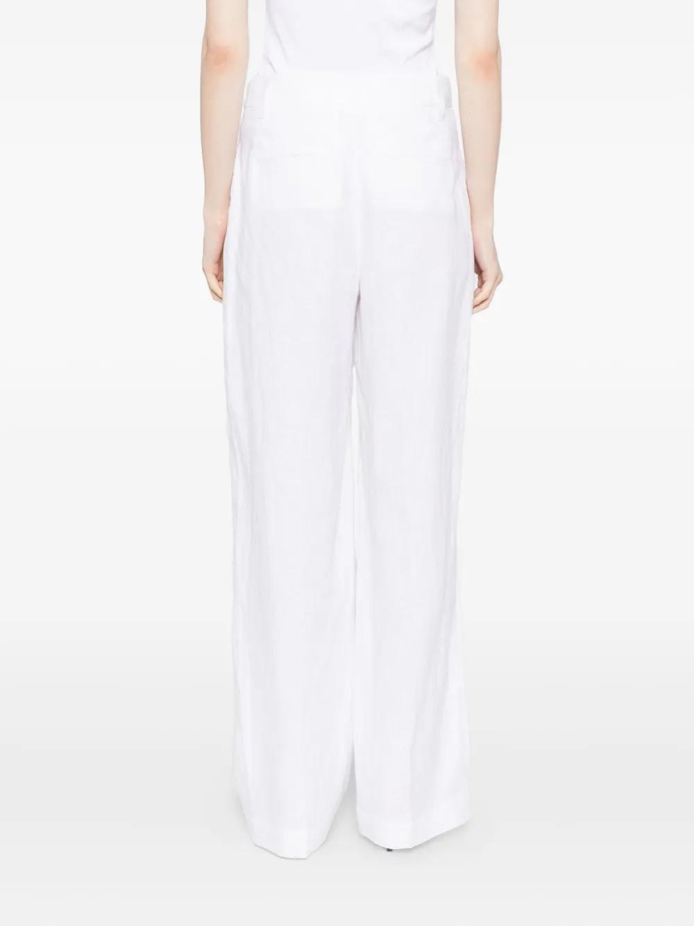 white concealed front button, hook and zip fastening two side slash pockets two rear welt pockets