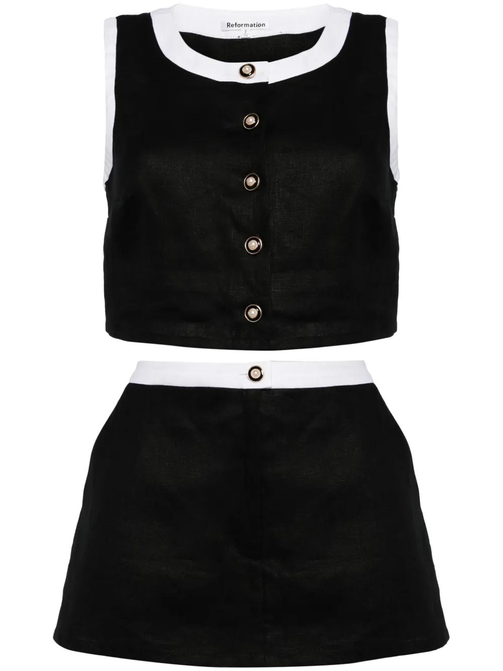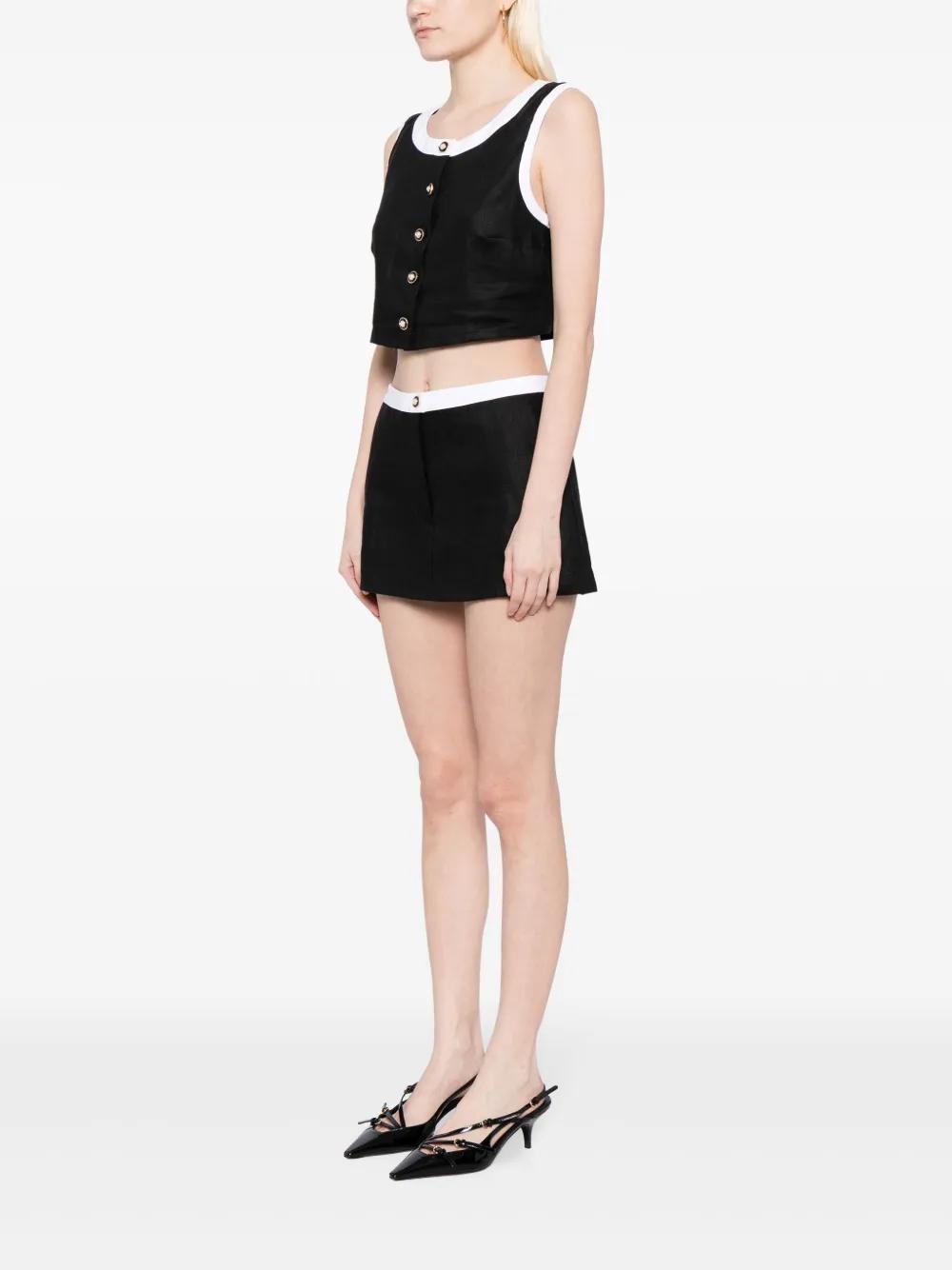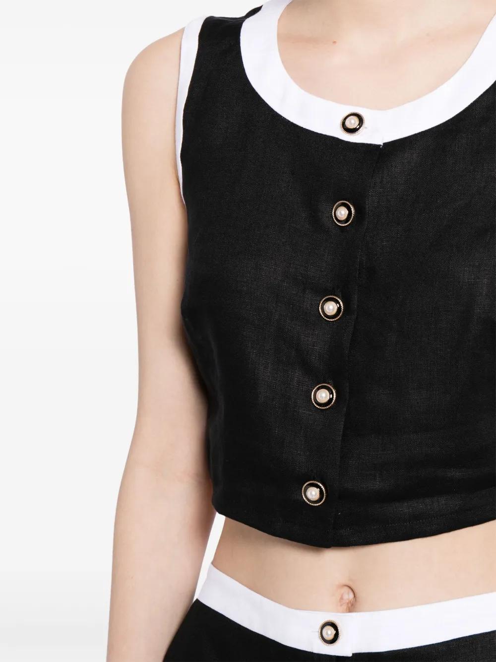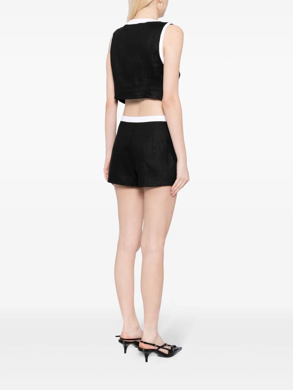black/white linen/flax Top: round neck sleeveless front button fastening straight hem cropped Shorts: high-waisted front button fastening slip pockets to the sides straight leg