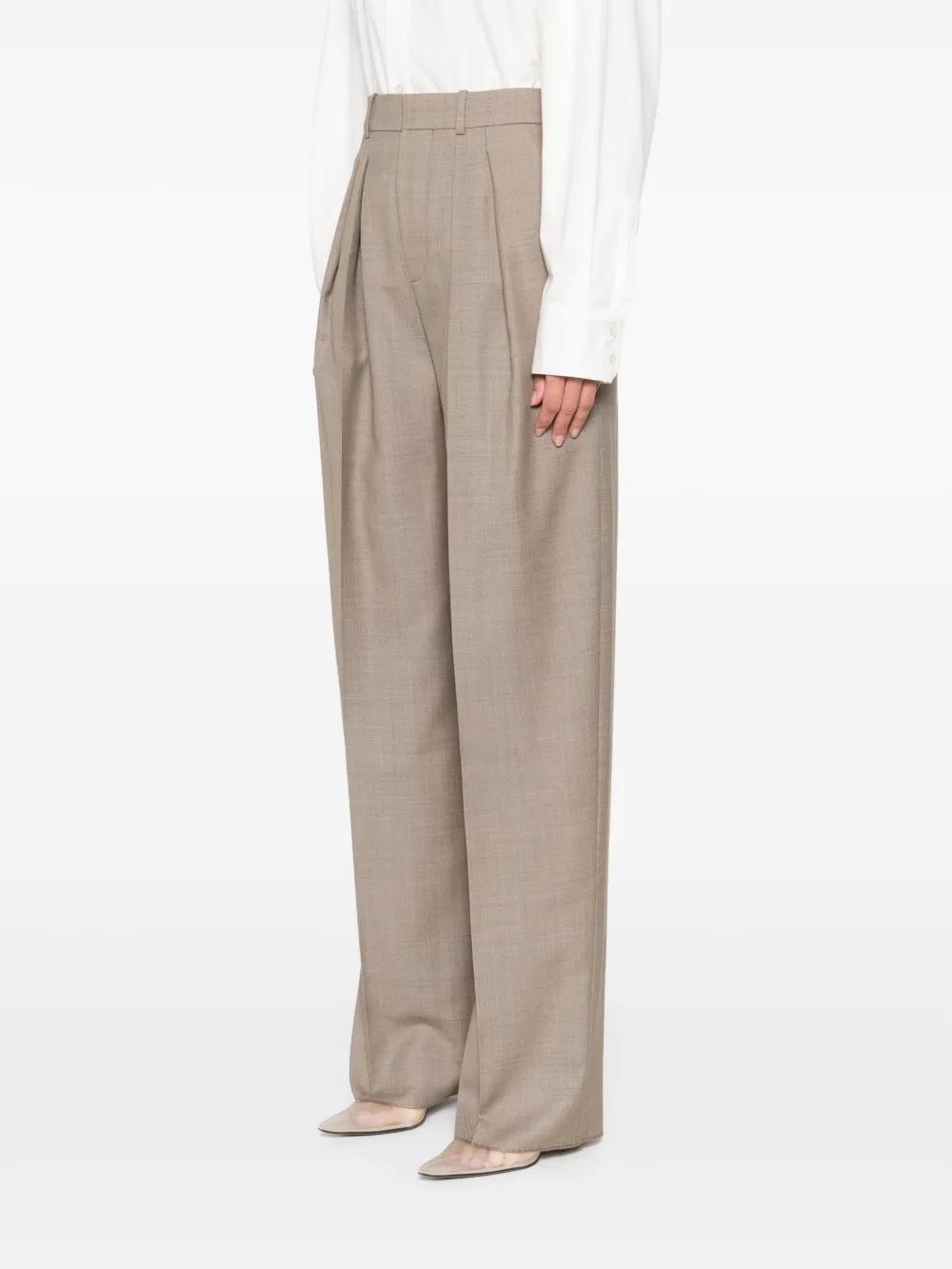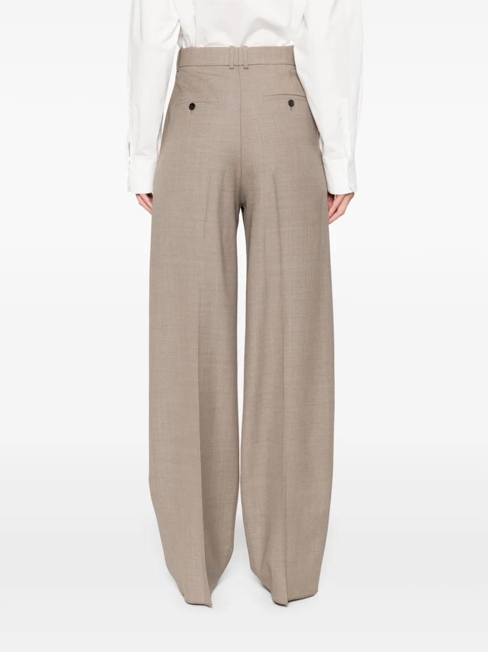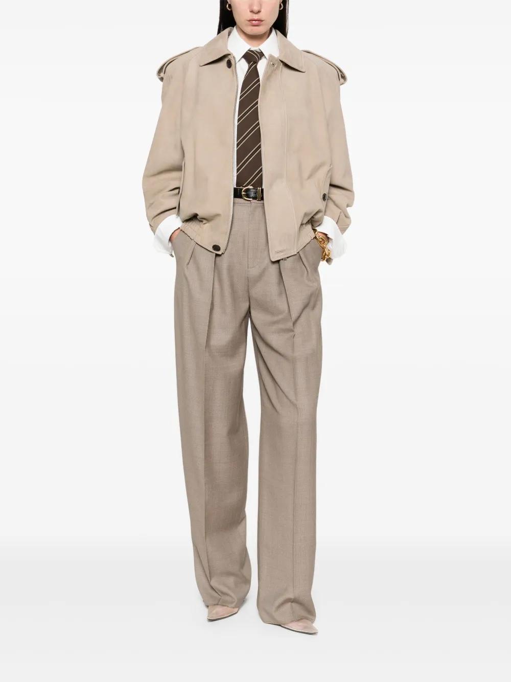 almond beige concealed front button, hook and zip fastening two side slit pockets two rear button-fastening jetted pockets belt loops