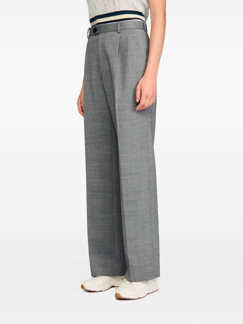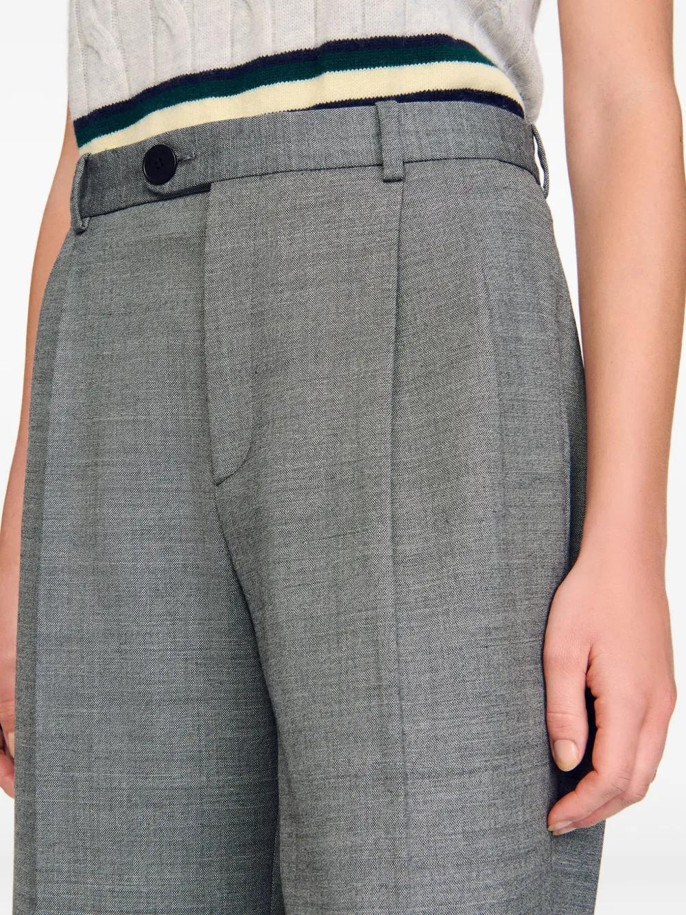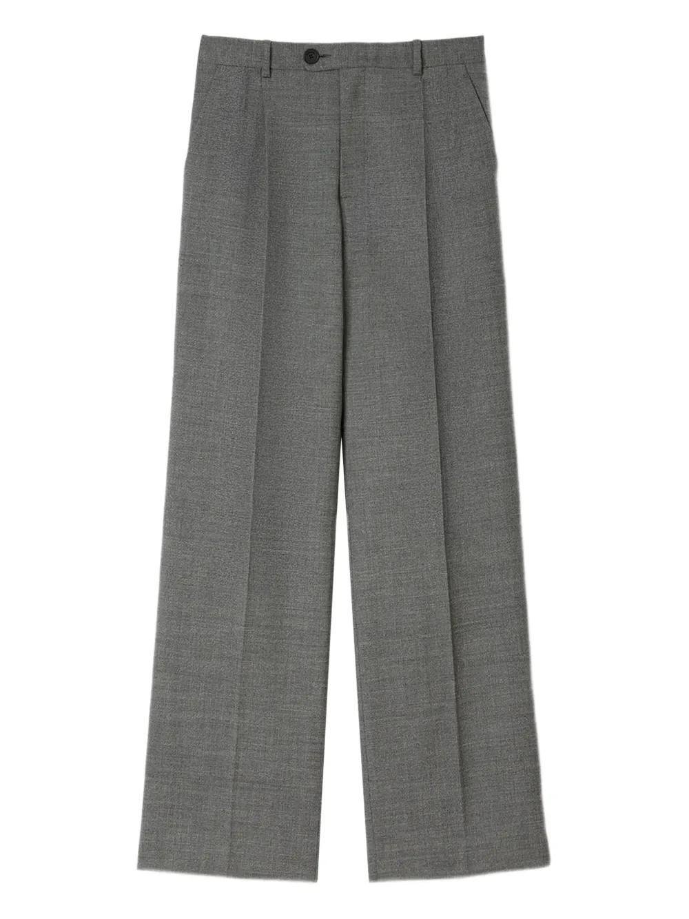 grey wool-blend pressed crease side diagonal pockets buttoned welt pockets belt loops