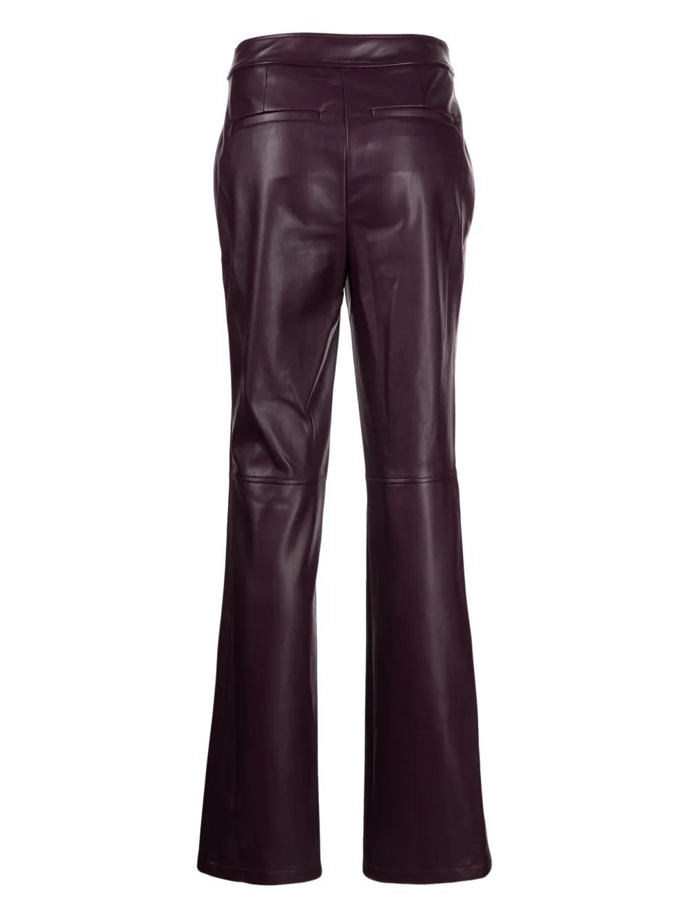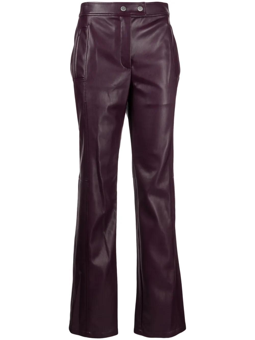 burgundy faux leather high-waisted front button and zip fastening two side welt pockets two rear welt pockets flared