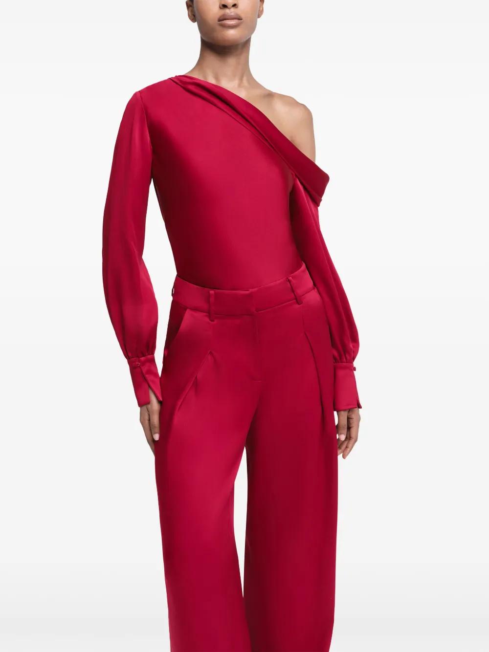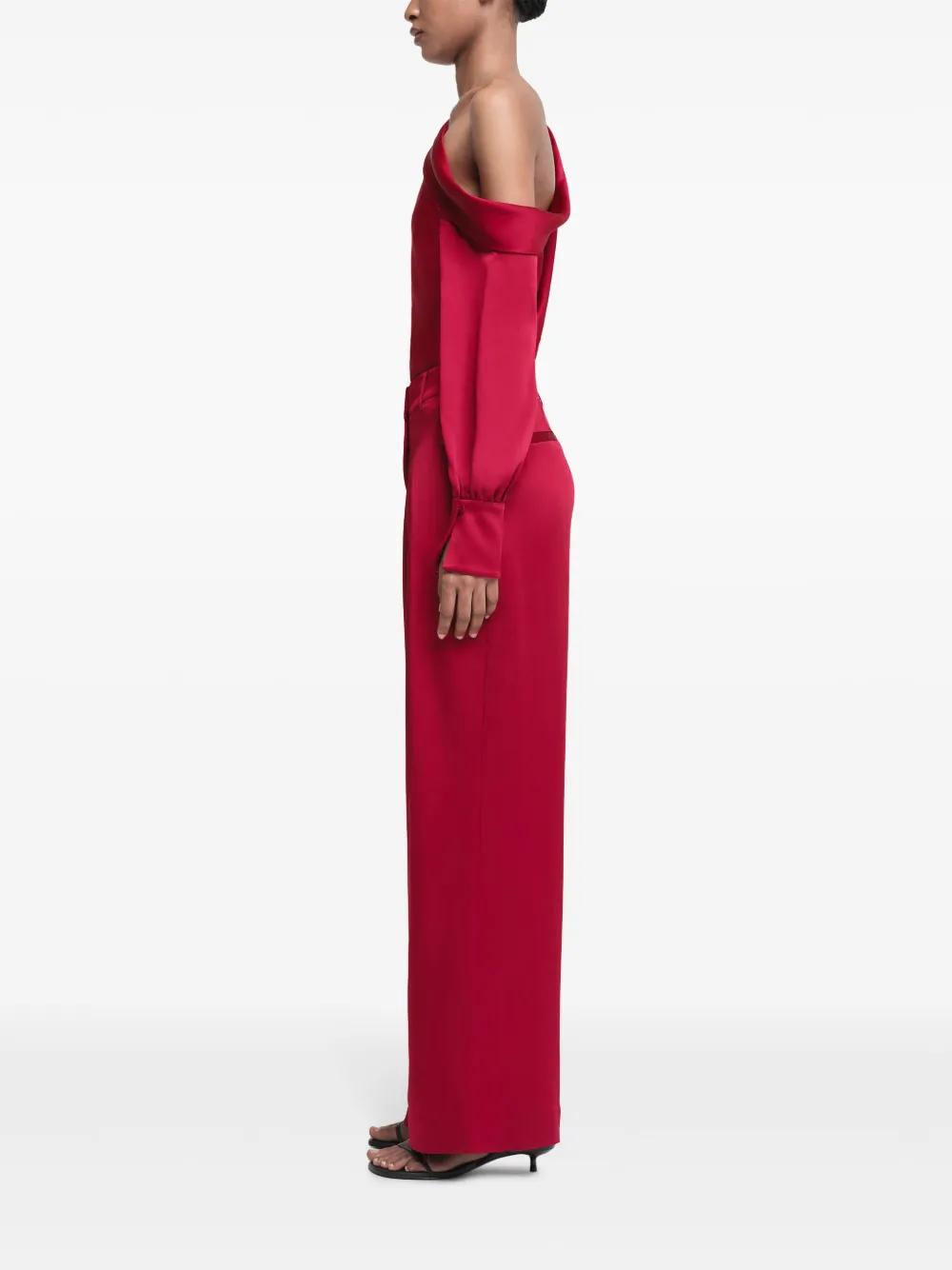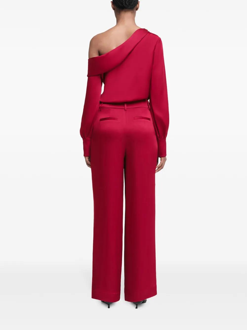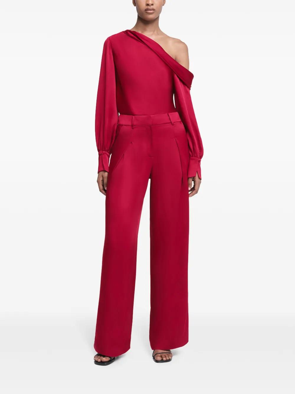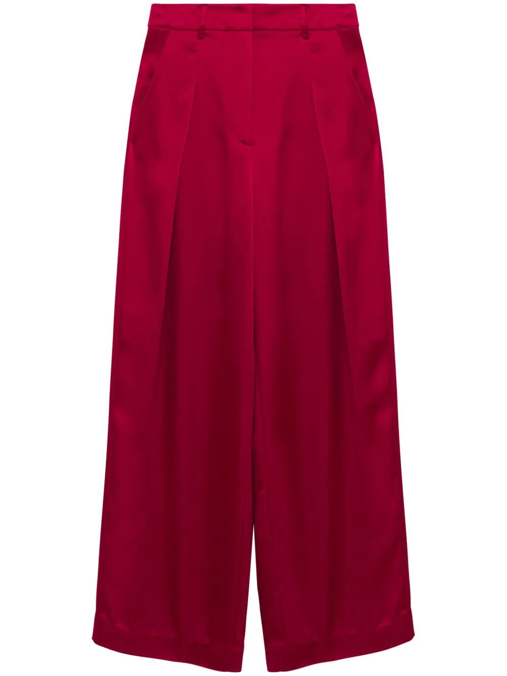 poppy red satin weave concealed front zip fastening high-rise belt loops pleat detailing slip pockets to the sides two rear welt pockets wide leg
