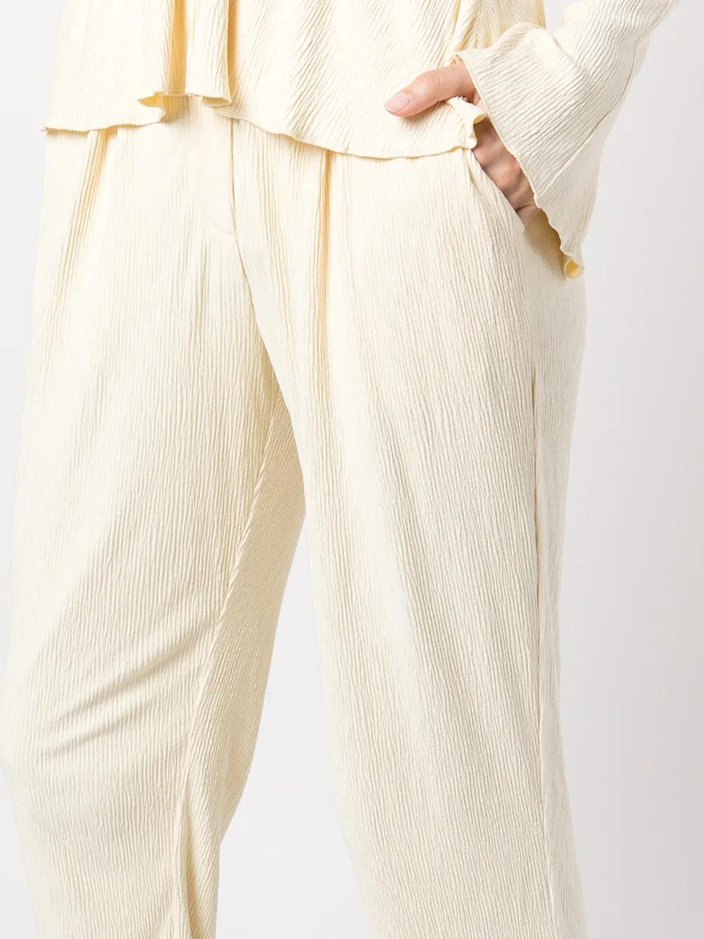 buttercream yellow plissé effect elasticated waistband two side slash pockets two rear welt pockets straight leg