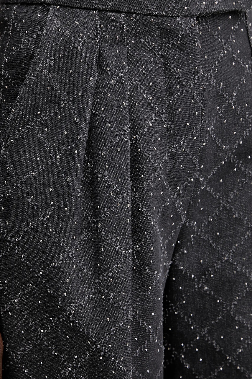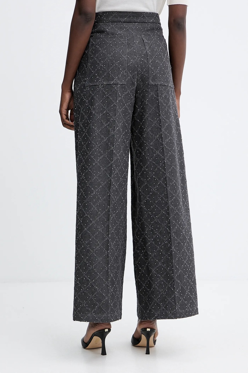 - Spodnie luźne w okolicy bioder i ud. - Model z podwyższoną talią i zapięciem na suwak, guzik i haftkę. - Rozszerzana nogawka. - Materiał z ozdobnymi zakładkami. - Dwie wsuwane kieszenie boczne. - Dwie wsuwane kieszenie na pośladkach. - Model z dżetami. - Szerokość w pasie: 37 cm. - Szerokość w biodrach: 47 cm. - Wysokość stanu: 33 cm. - Szerokość nogawki na dole: 33 cm. - Szerokość nogawki: 32 cm. - Długość zewnętrzna nogawki: 109 cm. - Wymiary podane dla rozmiaru: 36.