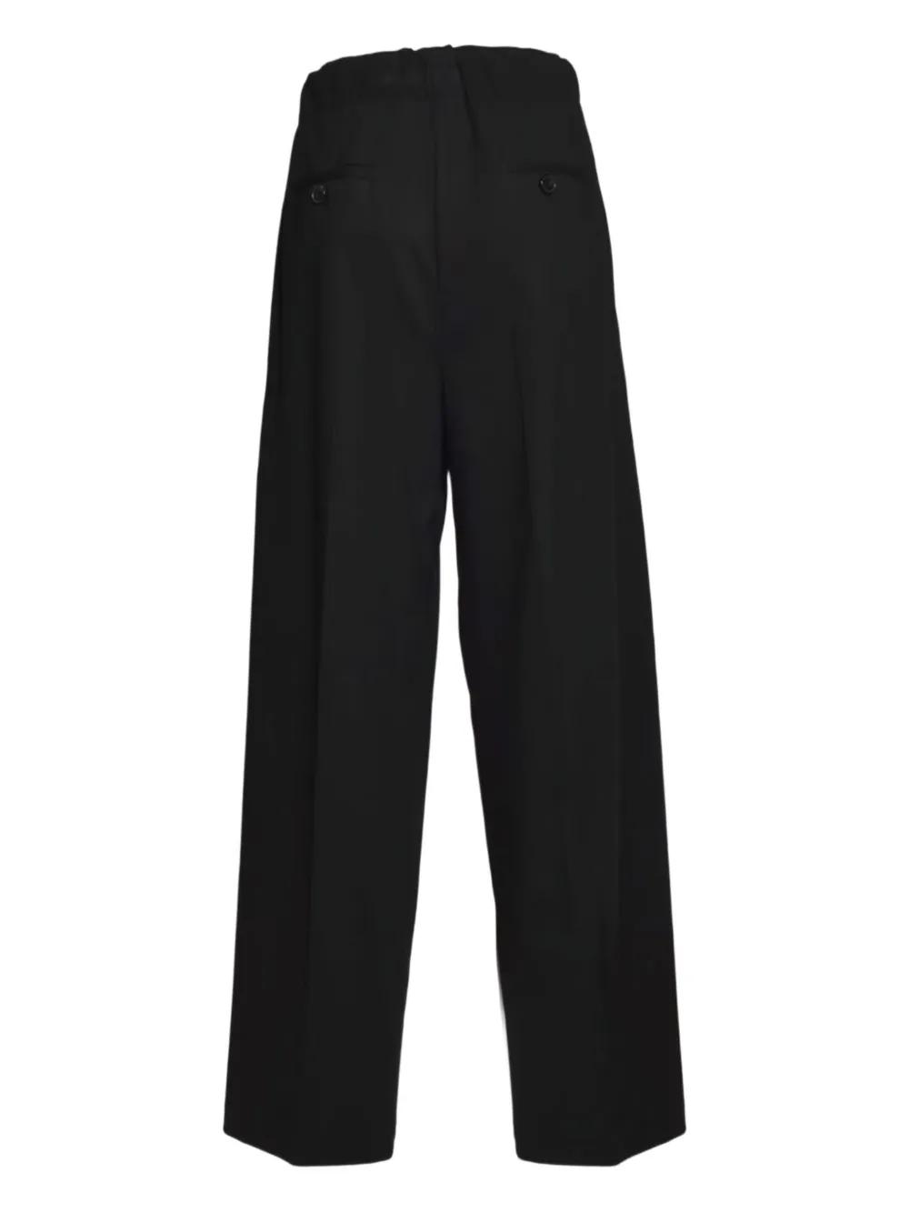 black elasticated waistband pleats side seam pockets rear welt pockets