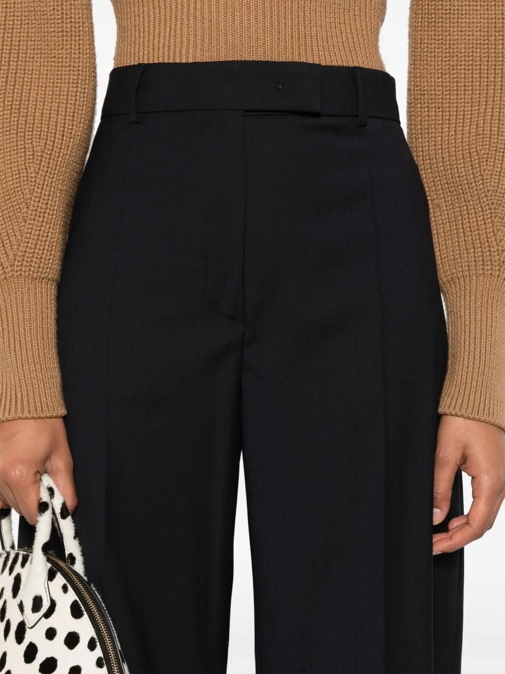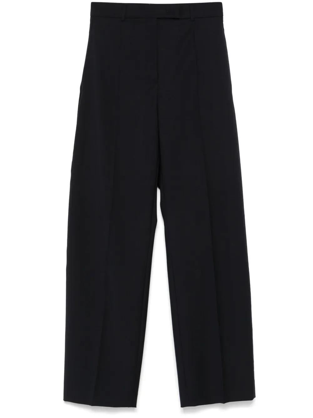 midnight blue virgin wool interwoven design concealed front button, hook and zip fastening mid-rise belt loops pressed crease slip pockets to the sides two rear jetted pockets straight leg