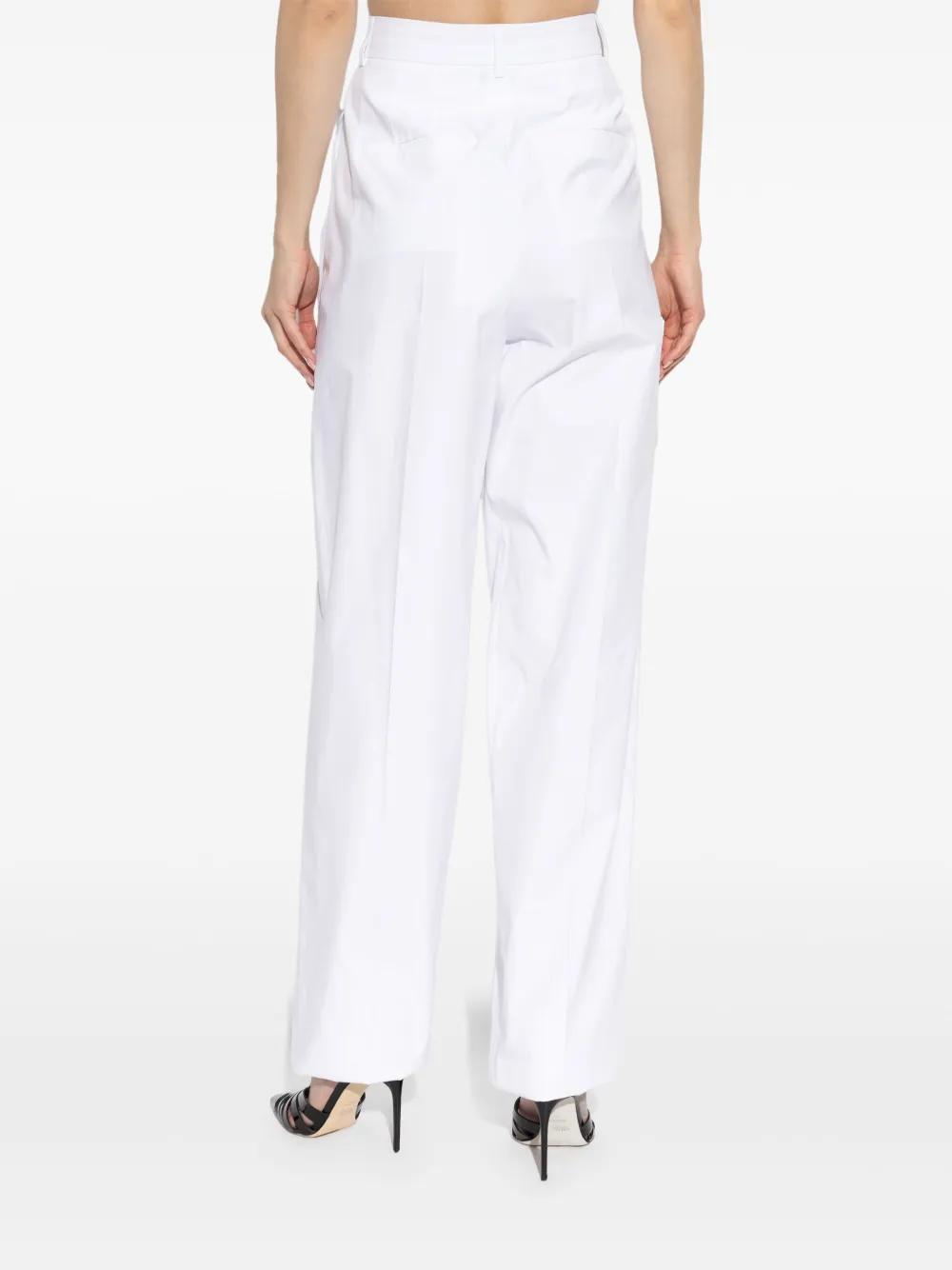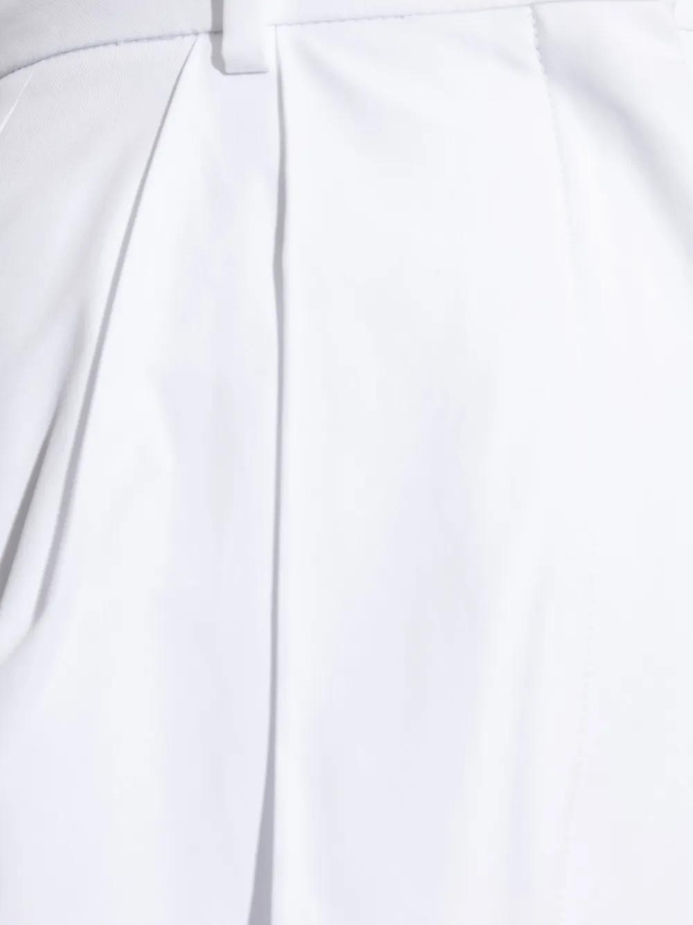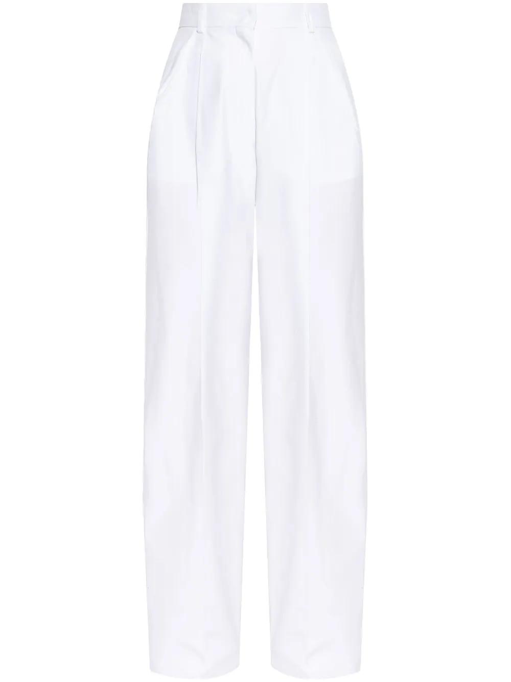 white pleat front design wide-leg silhouette hidden side pockets belt loops hook and zip fastening