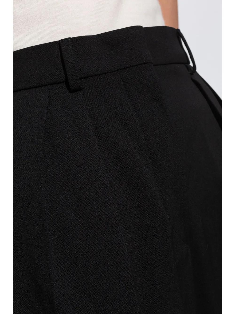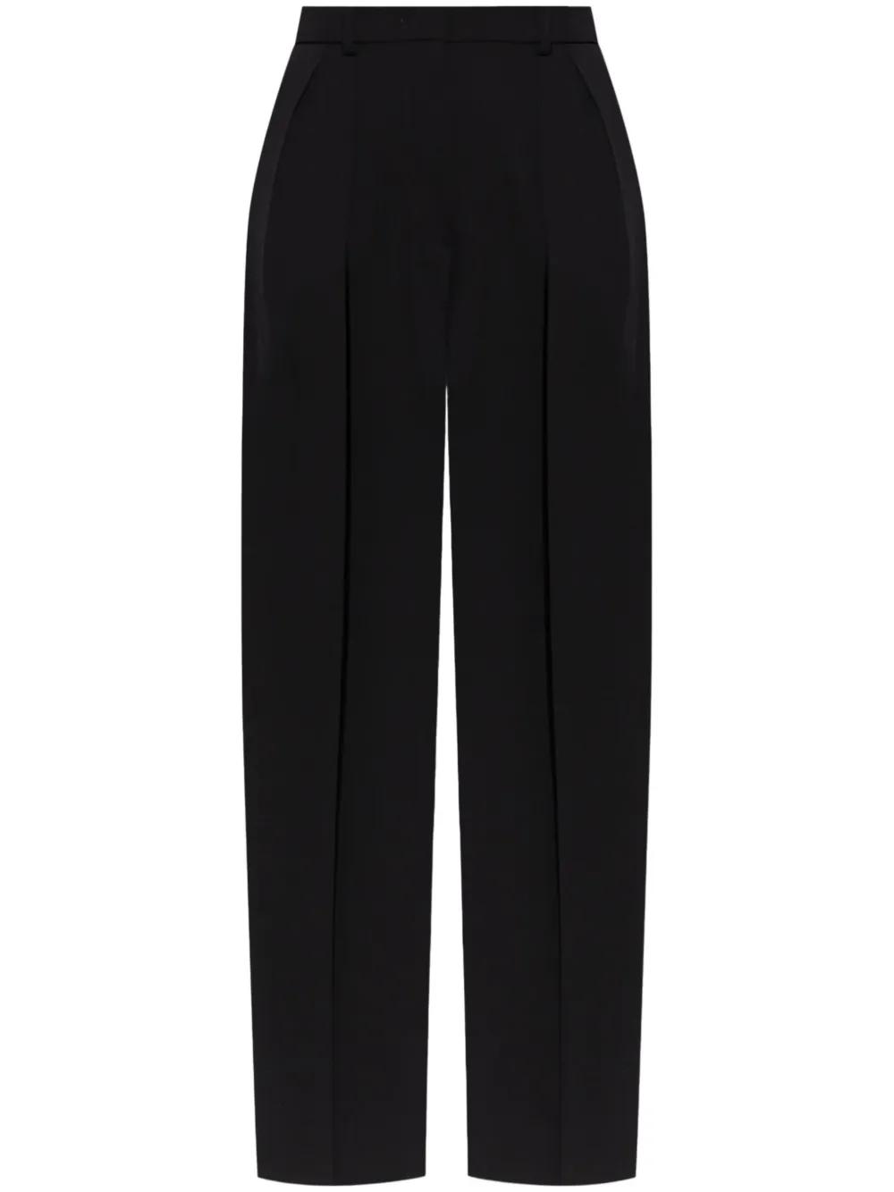 black wool blend high-waisted pleat detailing concealed front button, hook and zip fastening belt loops two side slit pockets two rear jetted pockets long length