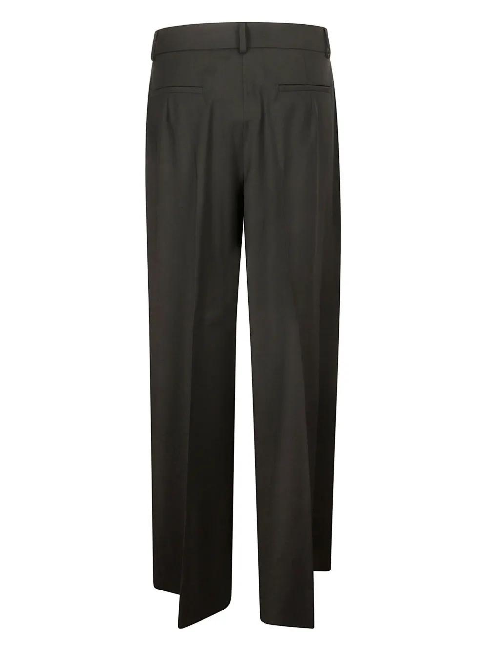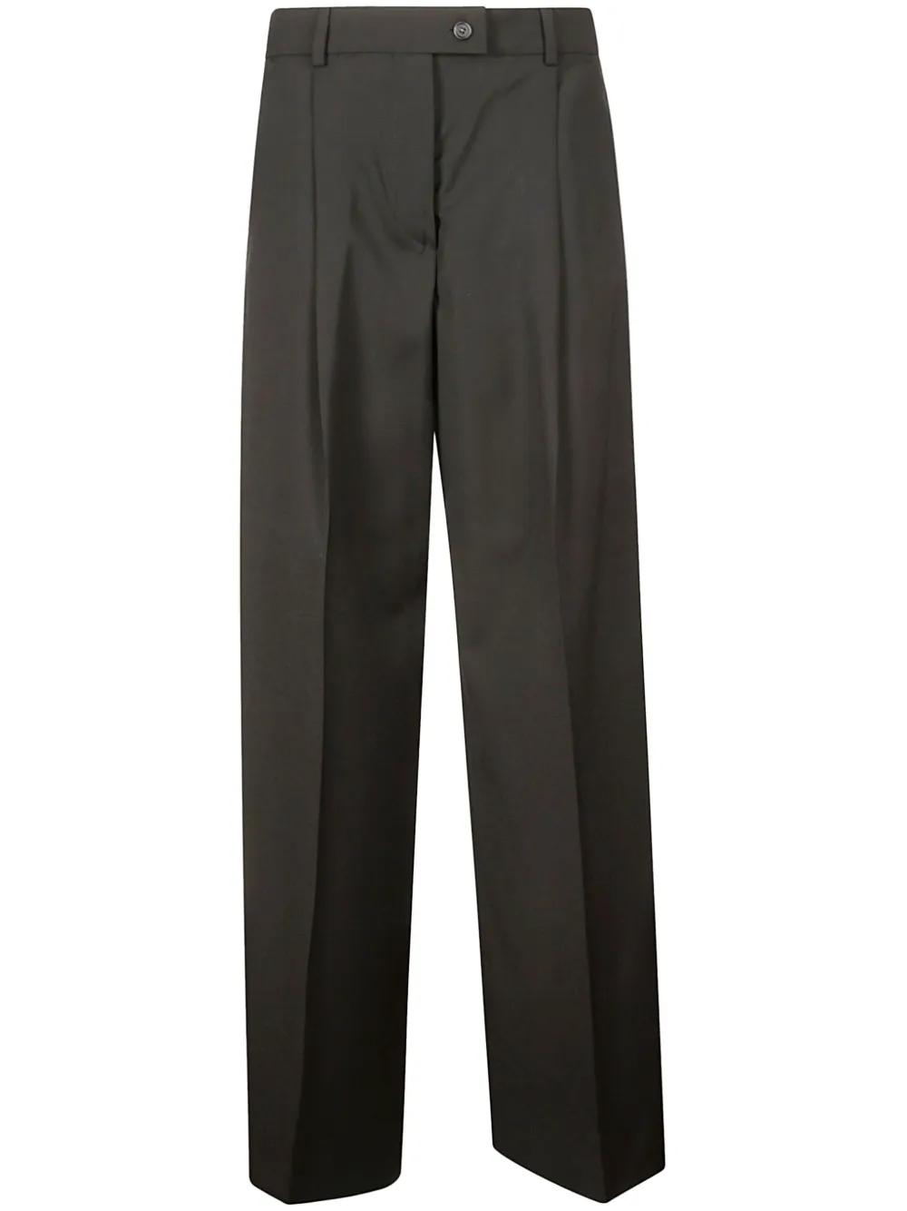 black tailored design pleat detailing pressed crease belt loops front button and zip fastening high-waisted two side inset pockets two rear jetted pockets wide leg