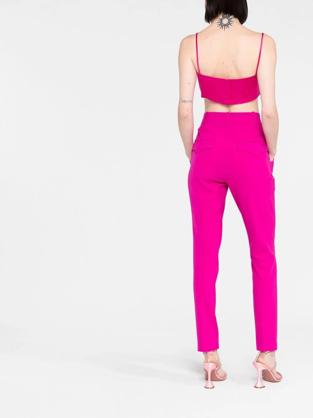 hot pink cotton high-waisted concealed front fastening belt loops two side inset pockets pressed crease tapered leg two rear flap pockets