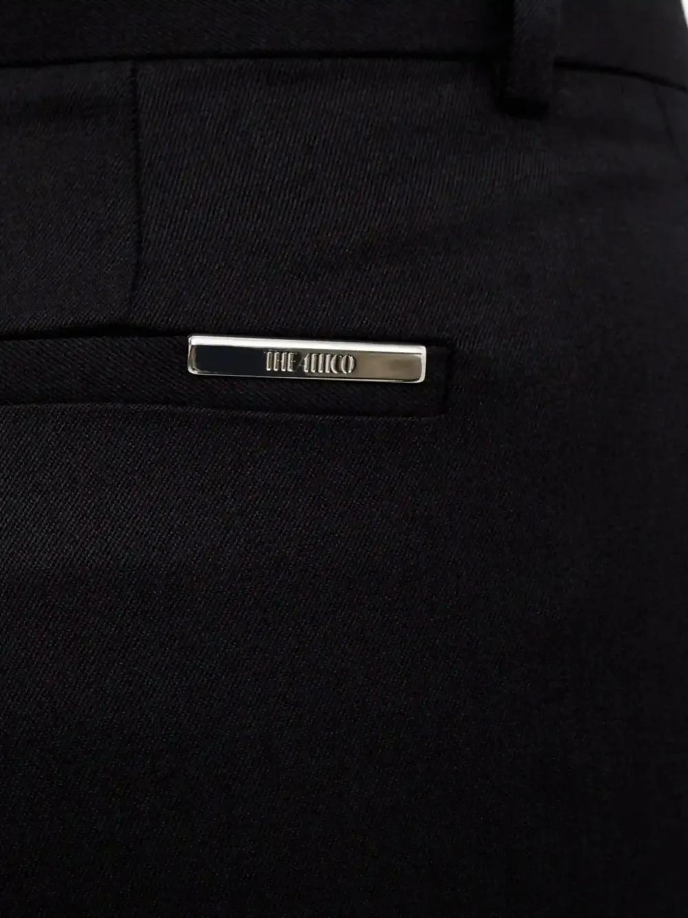 black belt loops concealed front fastening metal logo plaque pressed crease flared leg