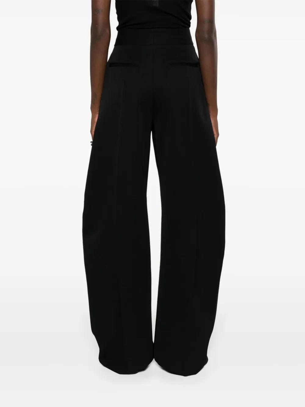 black virgin wool high waist concealed front fastening pleat detailing two side inset pockets two rear welt pockets wide leg