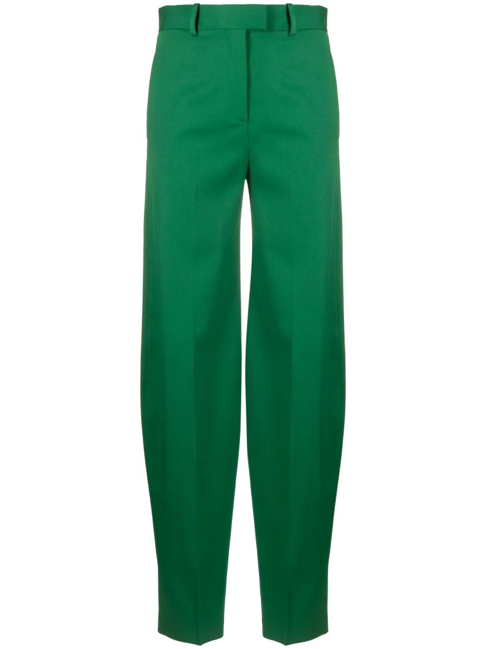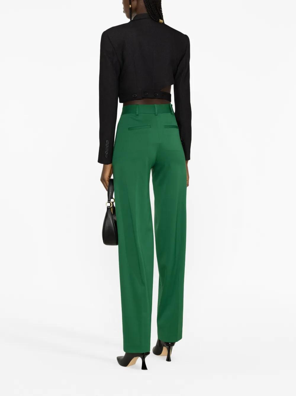 emerald green virgin wool blend high waist belt loops concealed front fastening two side inset pockets pressed crease two rear welt pockets tapered leg