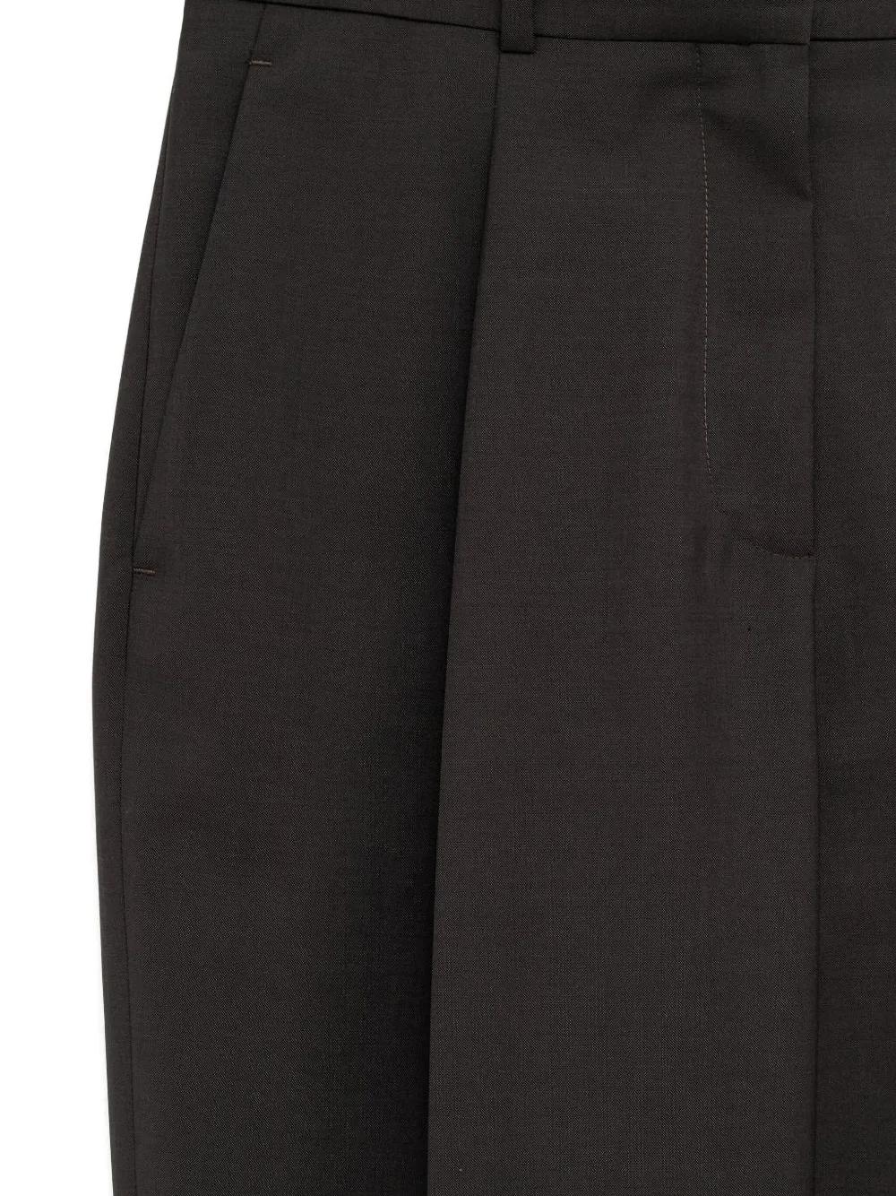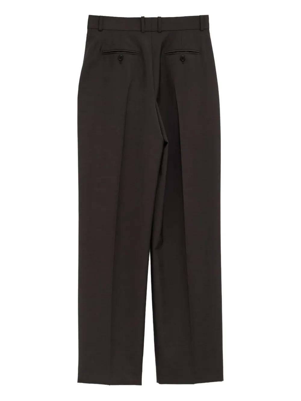 dark brown pleats belt loops side seam pockets back welt pockets concealed fastening