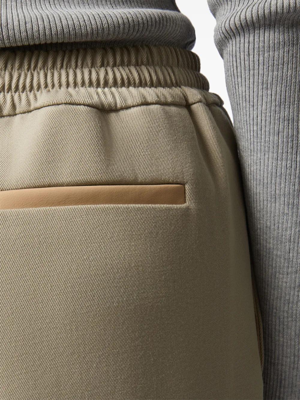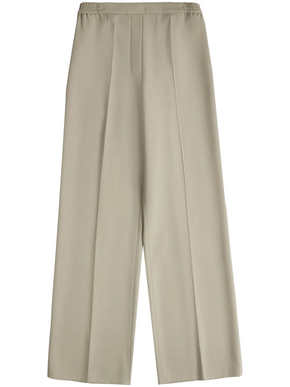 beige virgin wool pressed crease rear elasticated waistband rear welt pocket leather trim straight leg
