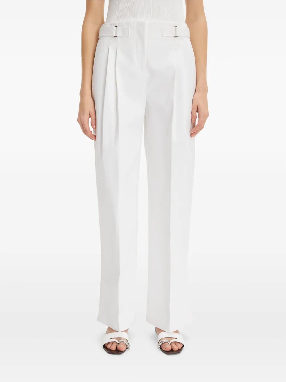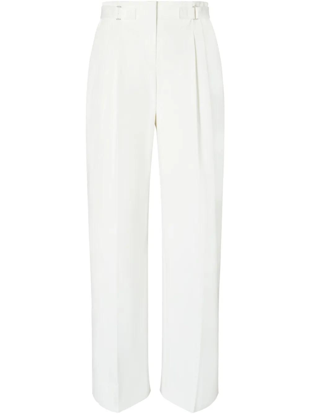 white concealed front fastening adjustable side straps two rear jetted pockets pleat detailing