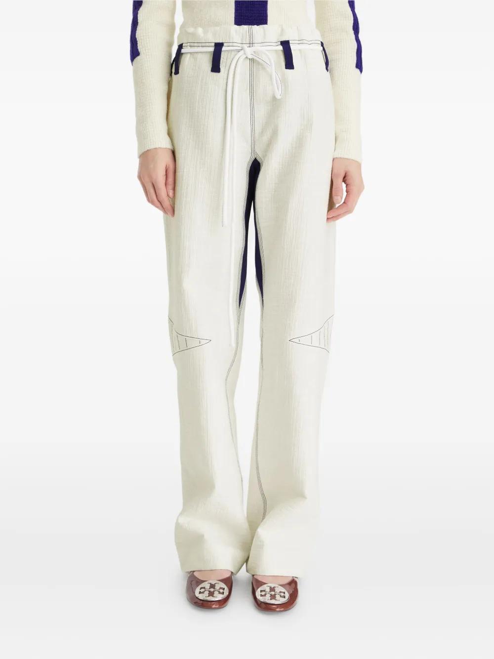 cream white drawstring waist contrasting inserts embroidered detailing side pockets relaxed fit