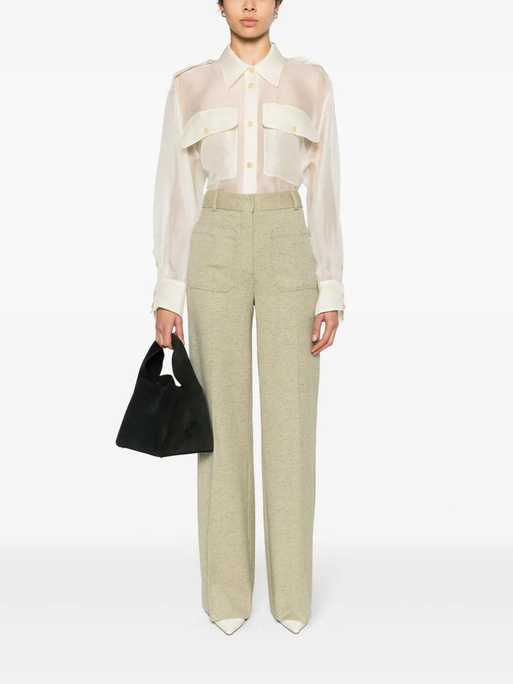 light green wool blend twill weave speckle knit pressed crease high-waisted belt loops concealed front button, hook and zip fastening two front patch pockets two rear patch pockets straight leg tailored cut