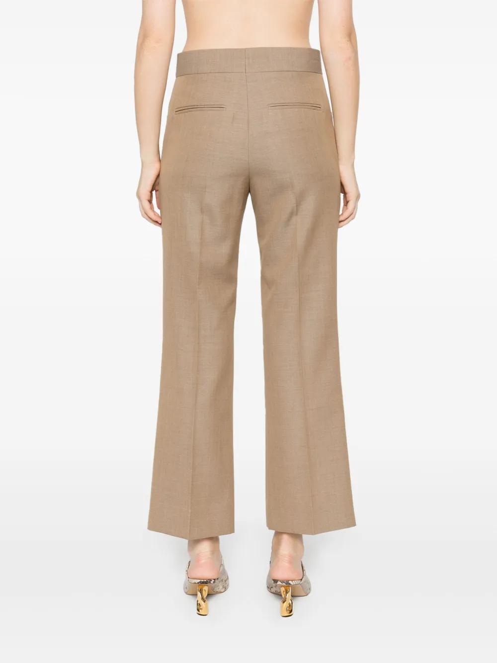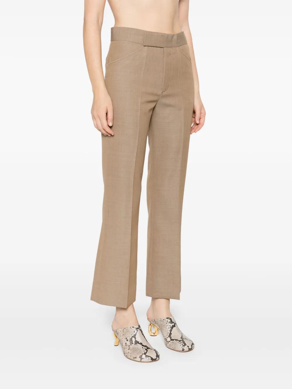 tobacco brown virgin wool crepe texture wide flared leg cropped concealed front button, hook and zip fastening two diagonal pockets to the sides two rear welt pockets pressed crease straight hem