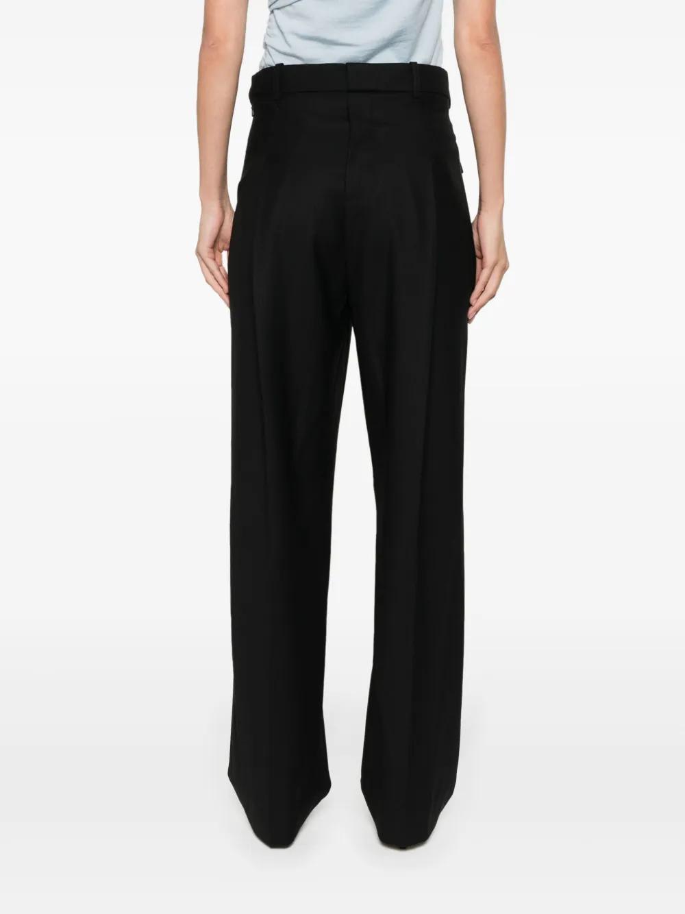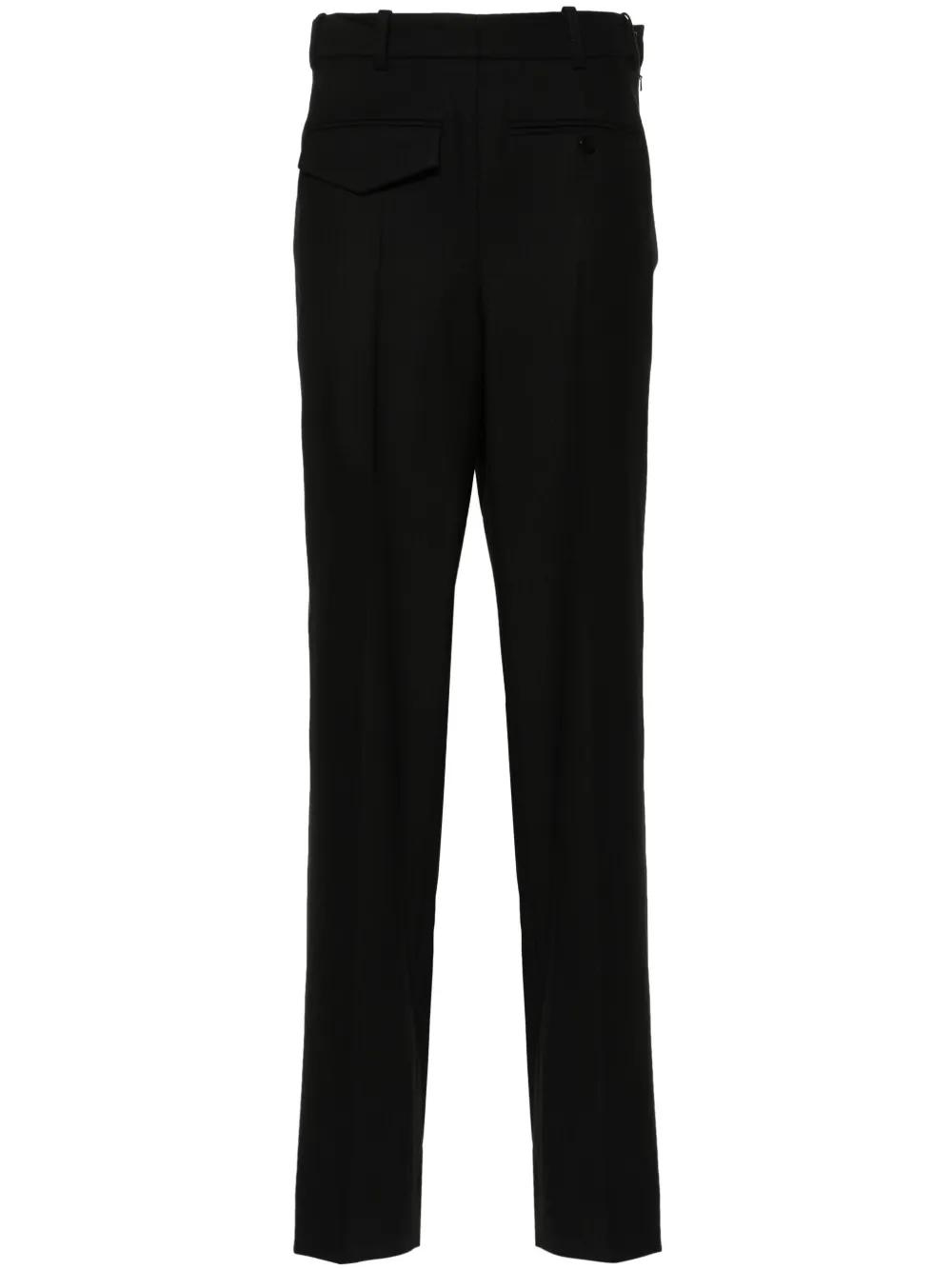 black twill weave pressed crease dart detailing logo-engraved buttons high-waisted tapered leg rear flap pocket rear button-fastening pocket belt loops concealed side hook and zip fastening unlined
