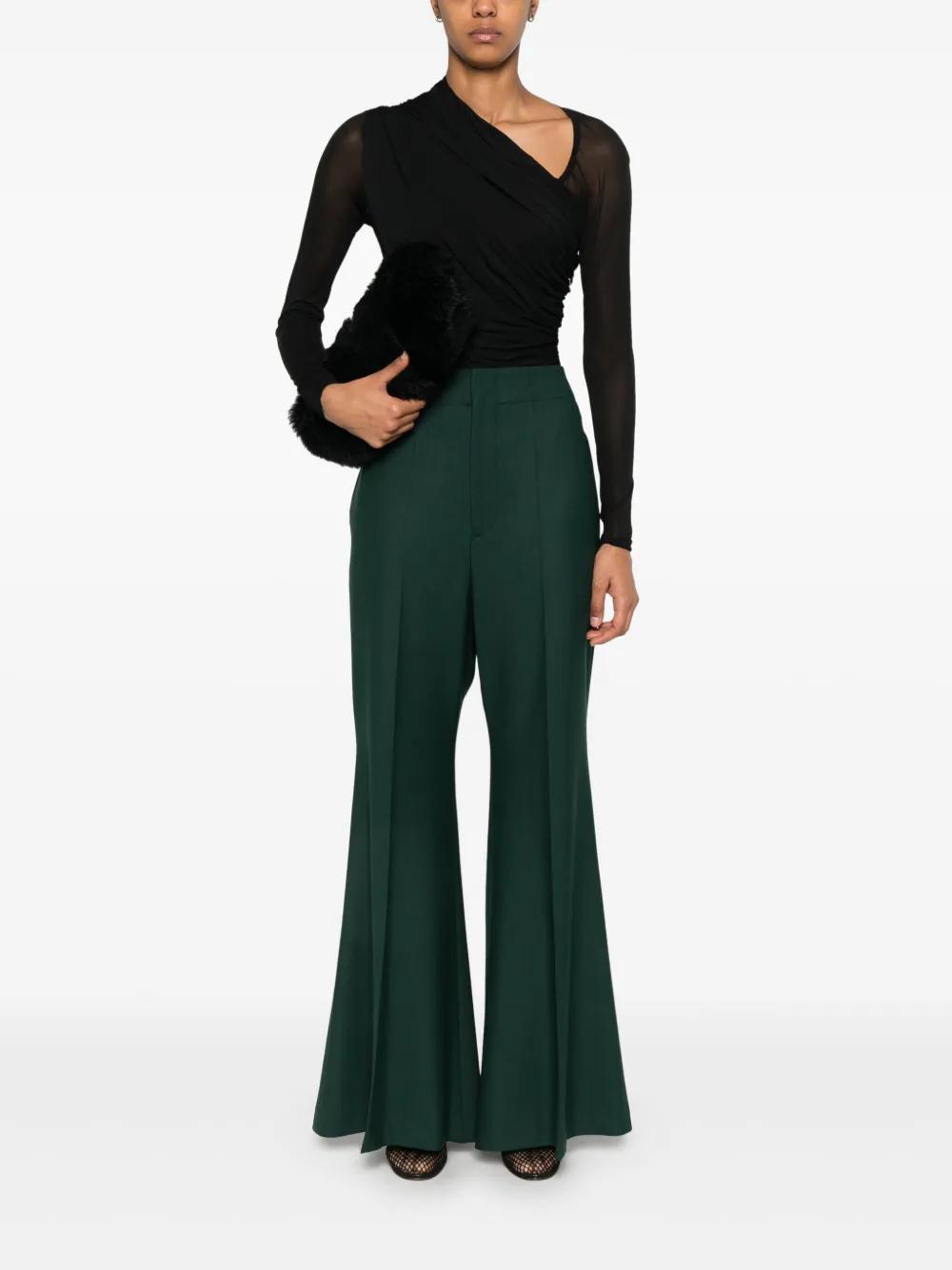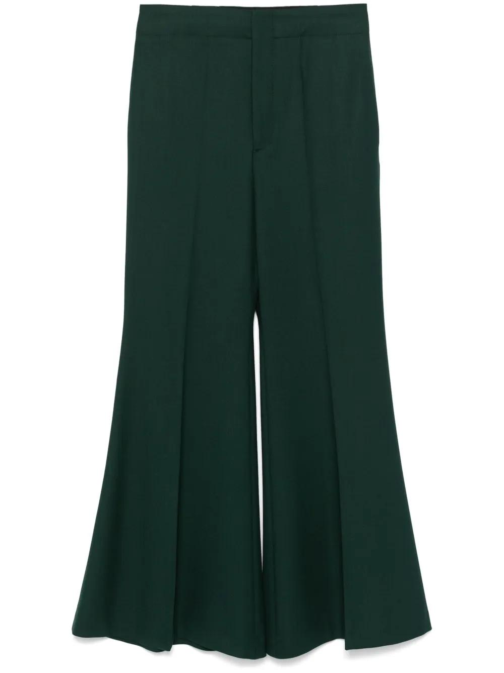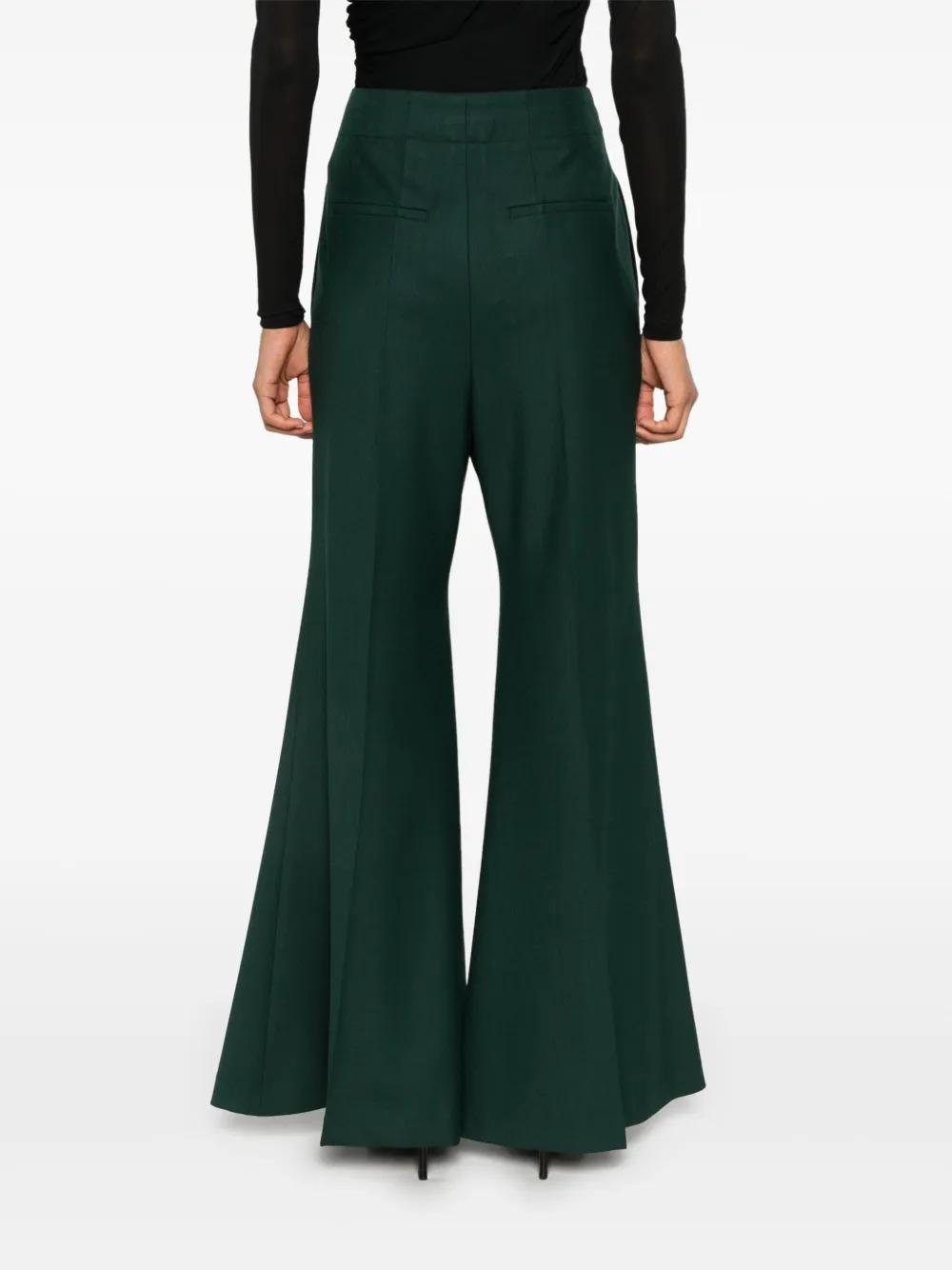 forest green twill weave wide leg concealed front button, hook and zip fastening two side inset pockets pressed crease two rear welt pockets