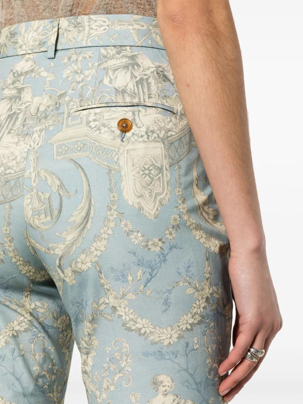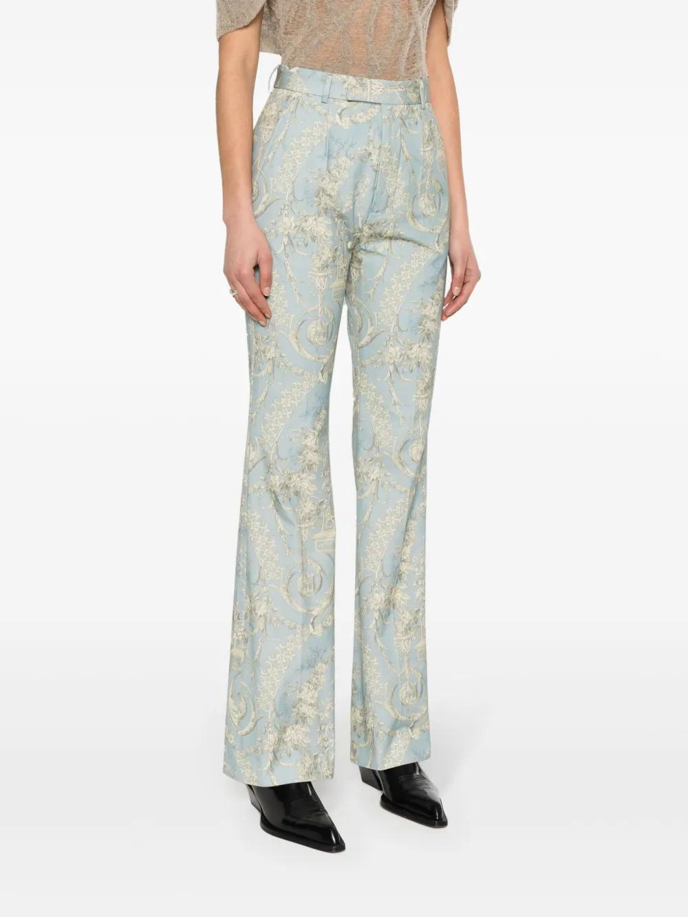 sky blue/cream white cotton all-over floral print high waist belt loops two side slash pockets pleat detailing to the front rear button-fastening jetted pocket flared hem concealed front button, hook and zip fastening