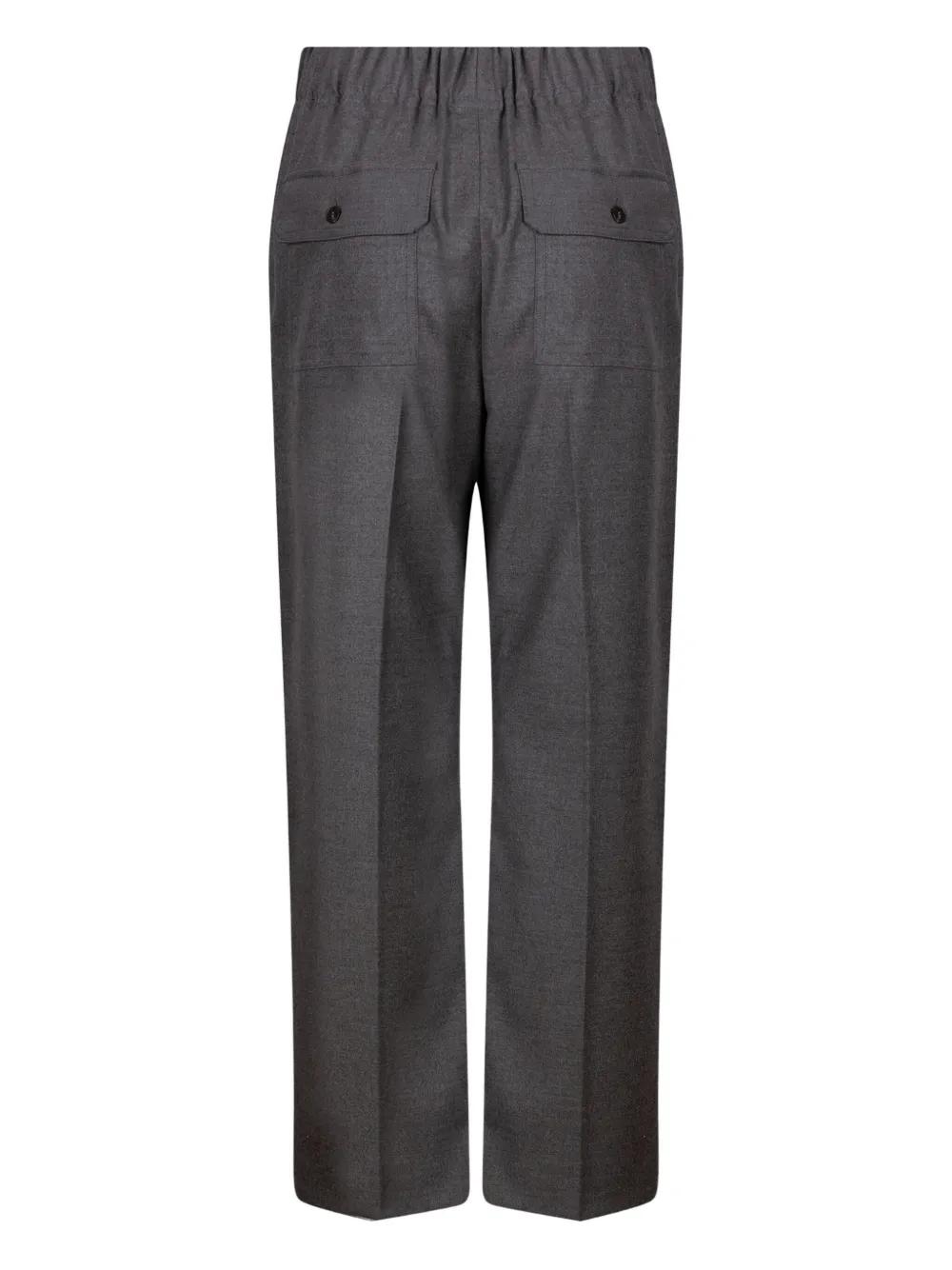 medium grey elasticated waistband pressed pleat rear patch pockets buttoned flap pockets