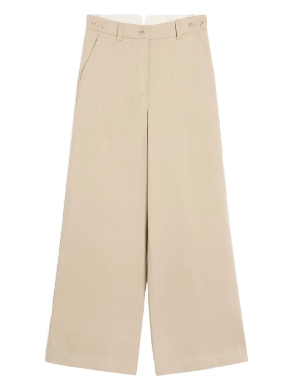 beige front button and zip fastening wide-leg belt loops side slit pockets rear welt pockets