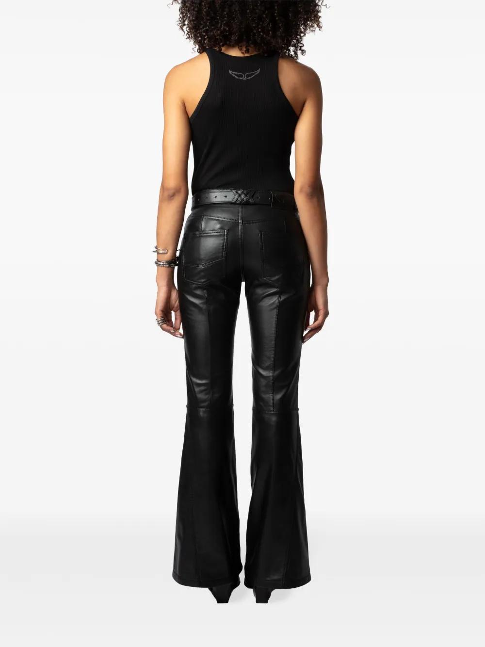 black lambskin glossy finish diamond-quilted detailing panelled design high-waisted concealed fly and button fastening belt loops flared two front patch pockets two rear patch pockets
