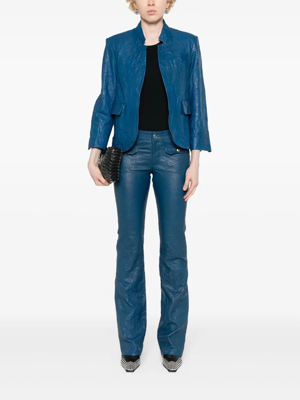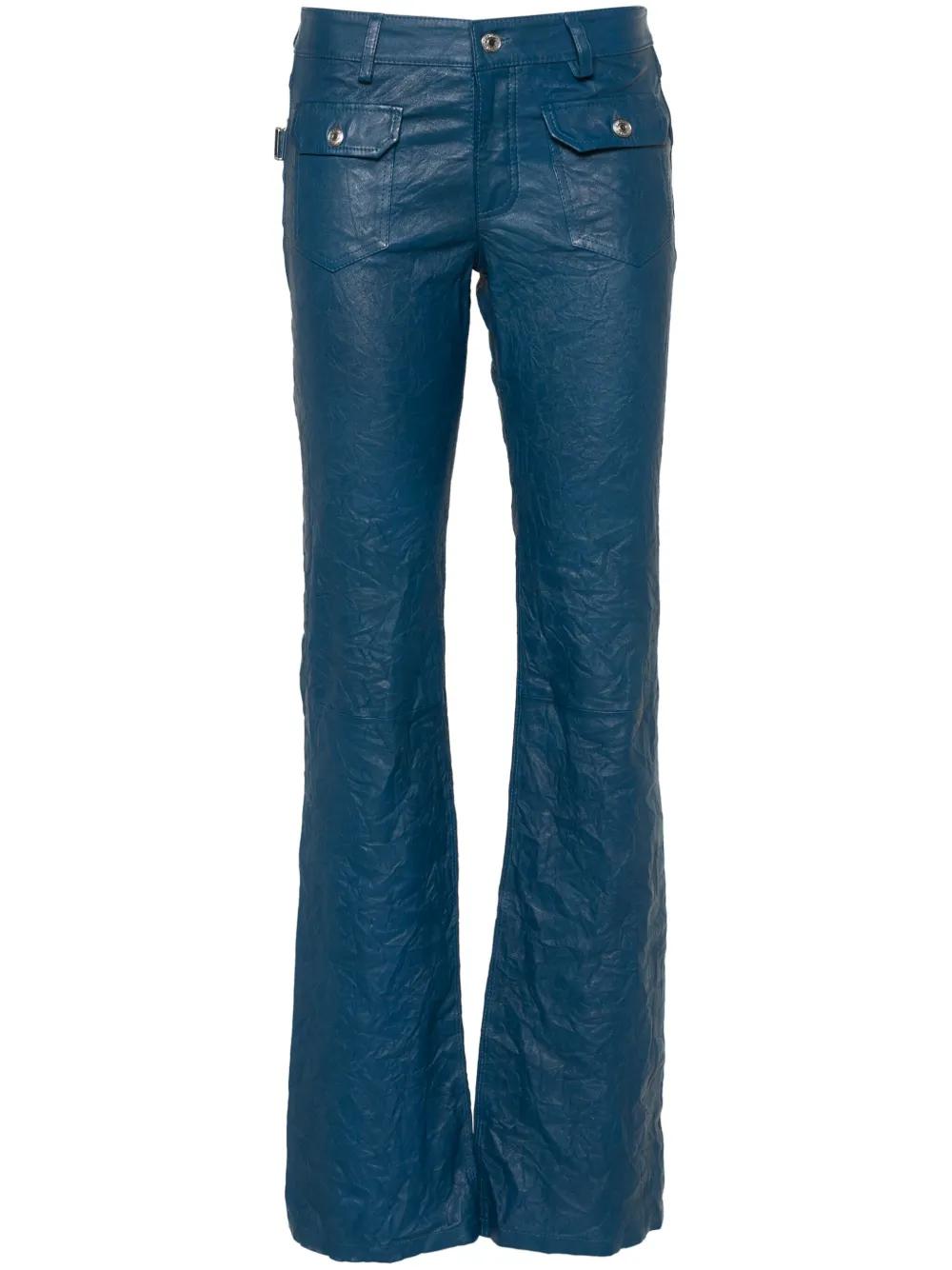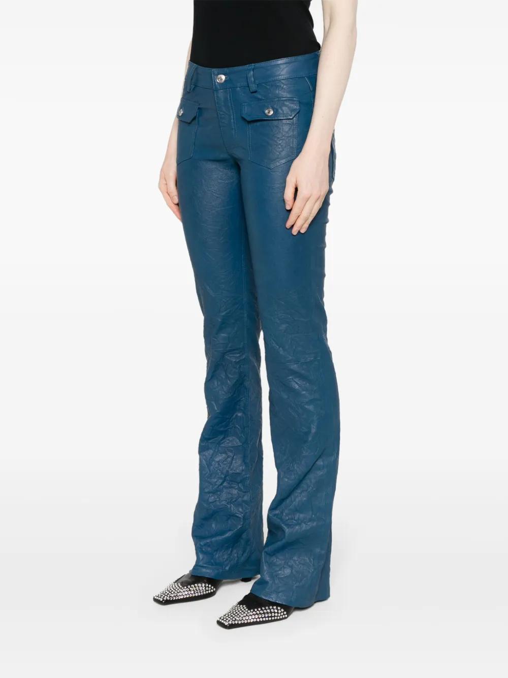 overseas blue lambskin crinkled finish tonal stitching belt loops two front flap pockets full-length logo patch to the rear two rear patch pockets flared hem front concealed zip-fly and button fastening