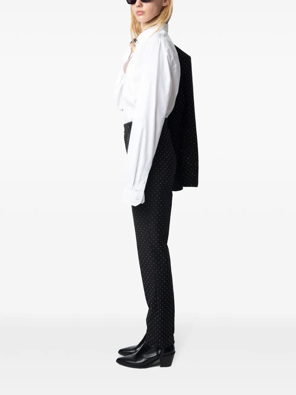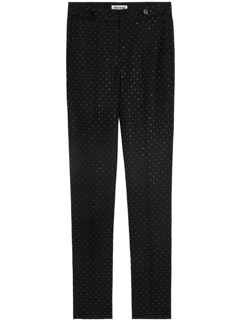 black hook and zip fly fastening two side slit pockets two rear welt pockets pressed crease