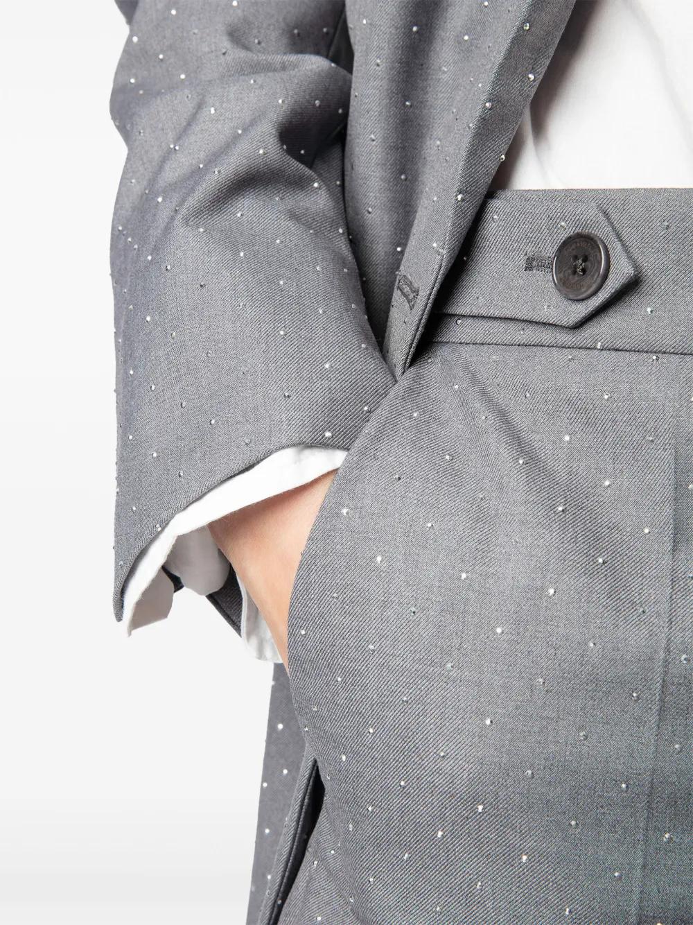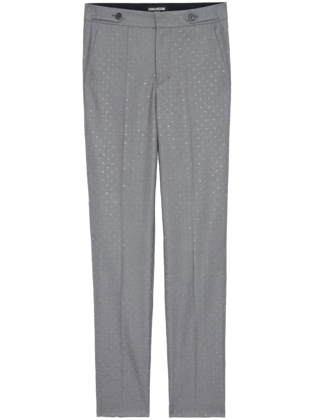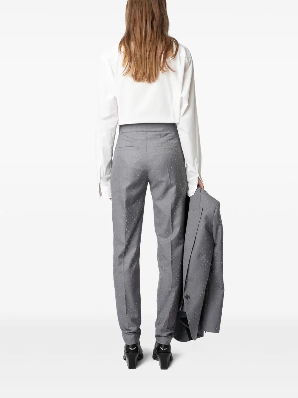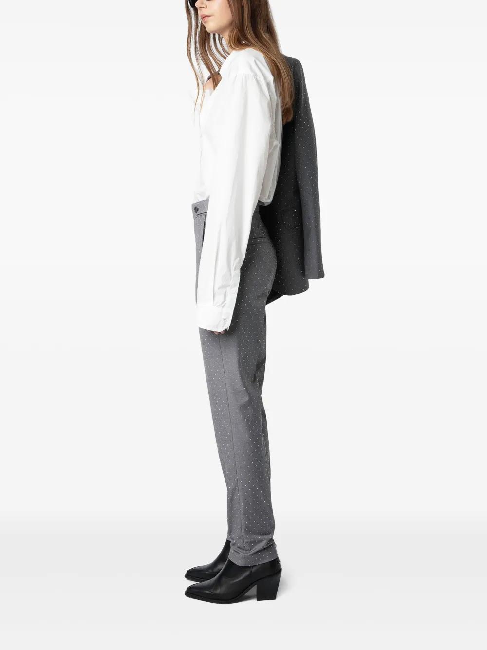 grey hook and zip fly fastening decorative-button waist tabs two side inset pockets two rear welt pockets