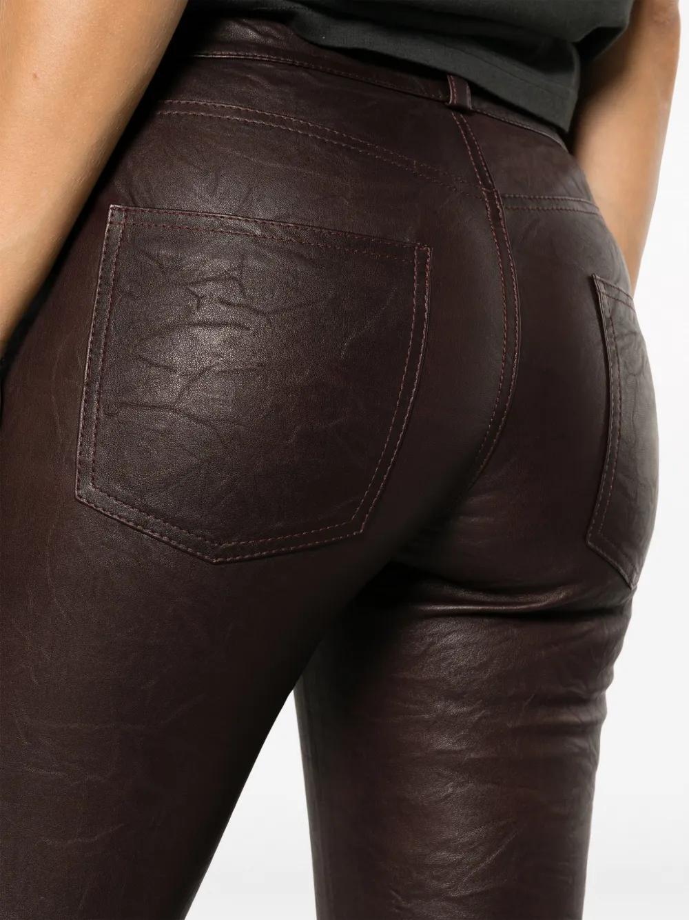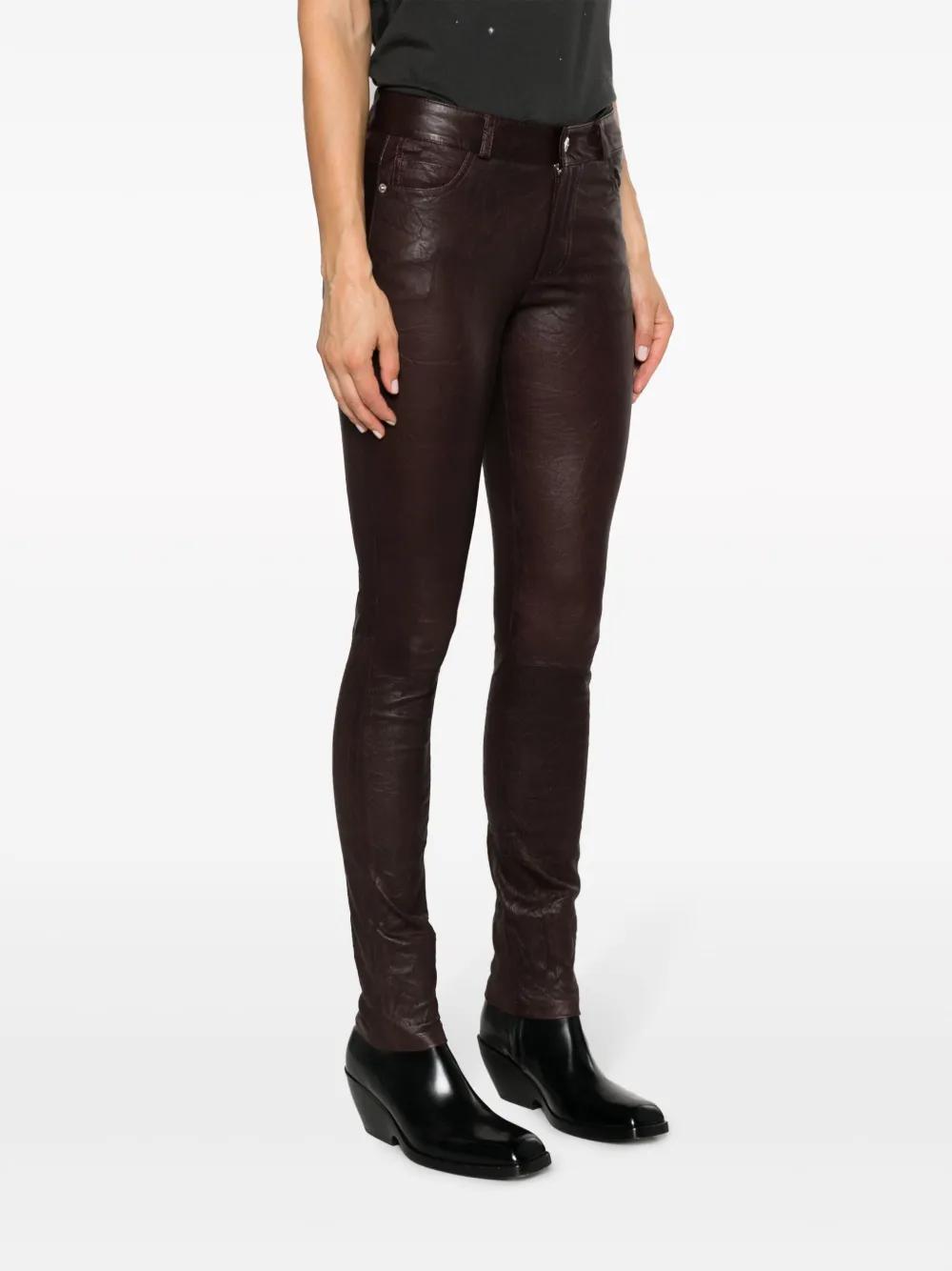 dark chocolate brown lambskin crinkled finish tonal stitching super-skinny cut mid-rise concealed fly and button fastening belt loops classic five pockets
